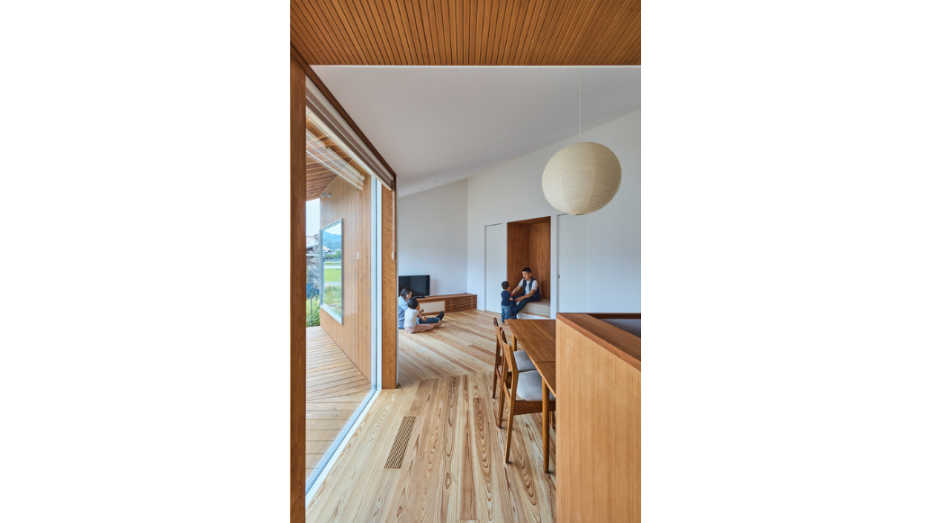 周囲には田んぼが広がり、遠景には山々が望める穏やかな環境。さまざまな角度から景色を楽しめるよう、開口の向きを一か所に限定せず、複数方向へ開く計画としました。建物の角度が変わることで、同じ庭の景色でも、大きな窓と小さな窓から見える景色では、緑の濃さや日差しの入り方が異なり、まったく違う表情を見せてくれます。