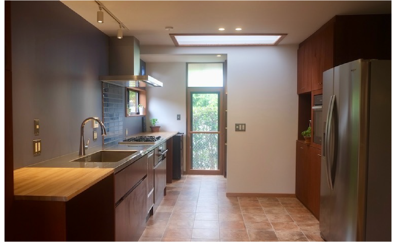 改修の中心となったキッチンは、かつてボイラー室だった奥のスペースを含めて全面的に再構成。既製品は使わず、1cm単位で調整する造作家具で使いやすさを追求しています。