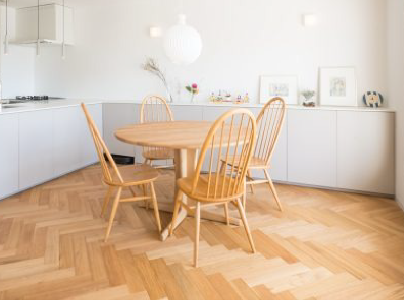 床はあえて小上がりを設けて段差を生み、視線の高さを揃えながら光の滞留をつくっている。ヘリンボーン張りの床材はお施主さんのこだわりで、空間を引き締めるデザイン性と落ち着きを両立。
