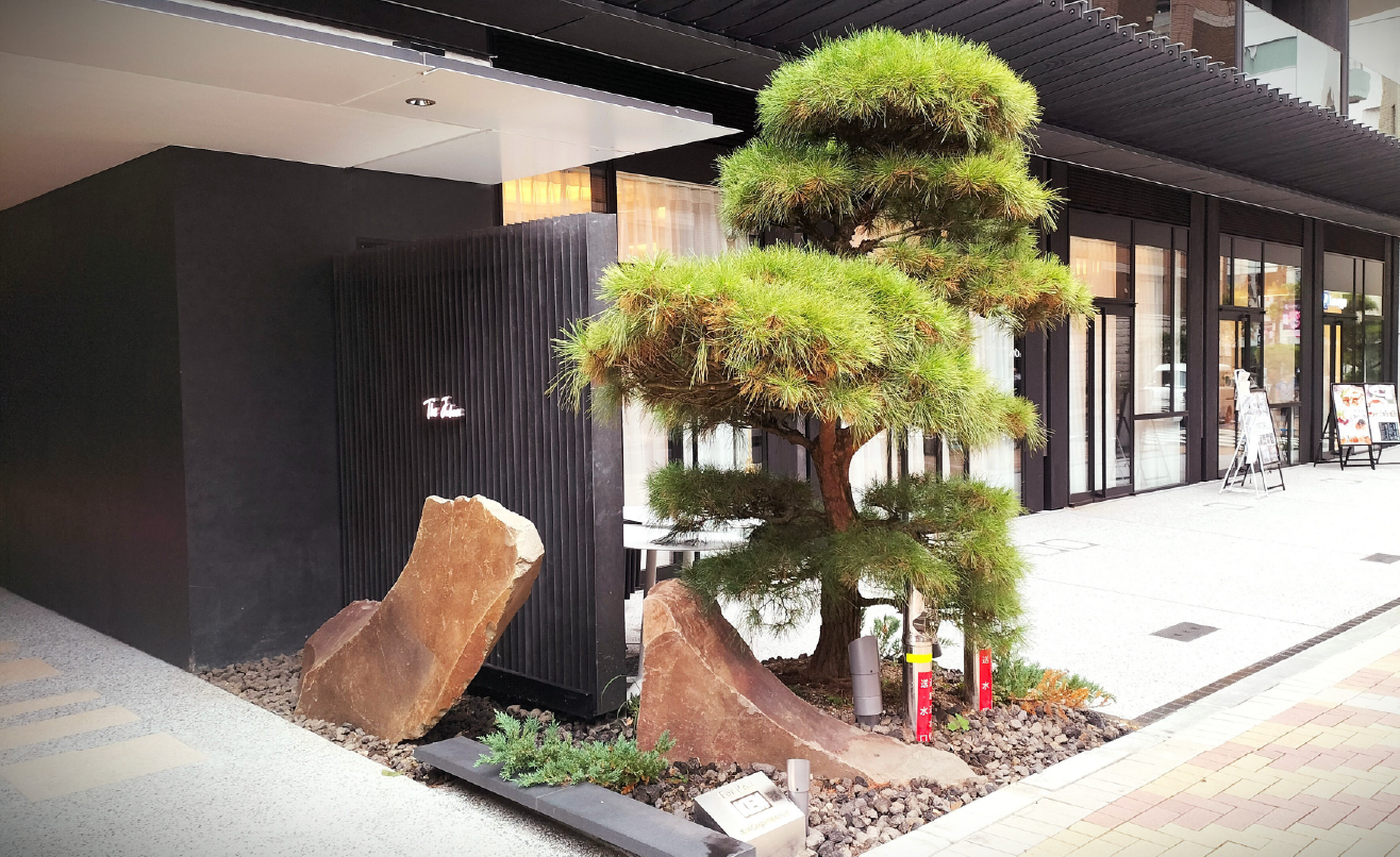 風景に対し建物や木塀は黒に近いブラウンで統一。素材そのものを長持ちさせるように考慮し試験塗りを重ねて色味が選ばれました。