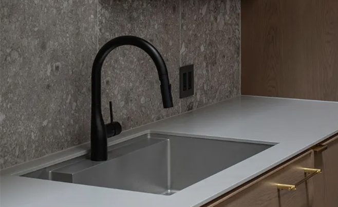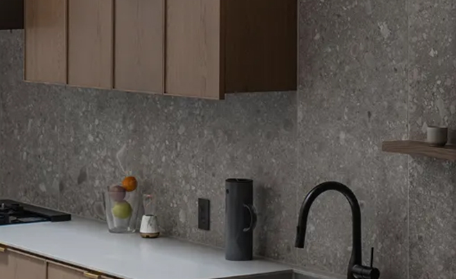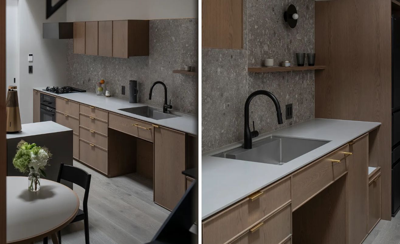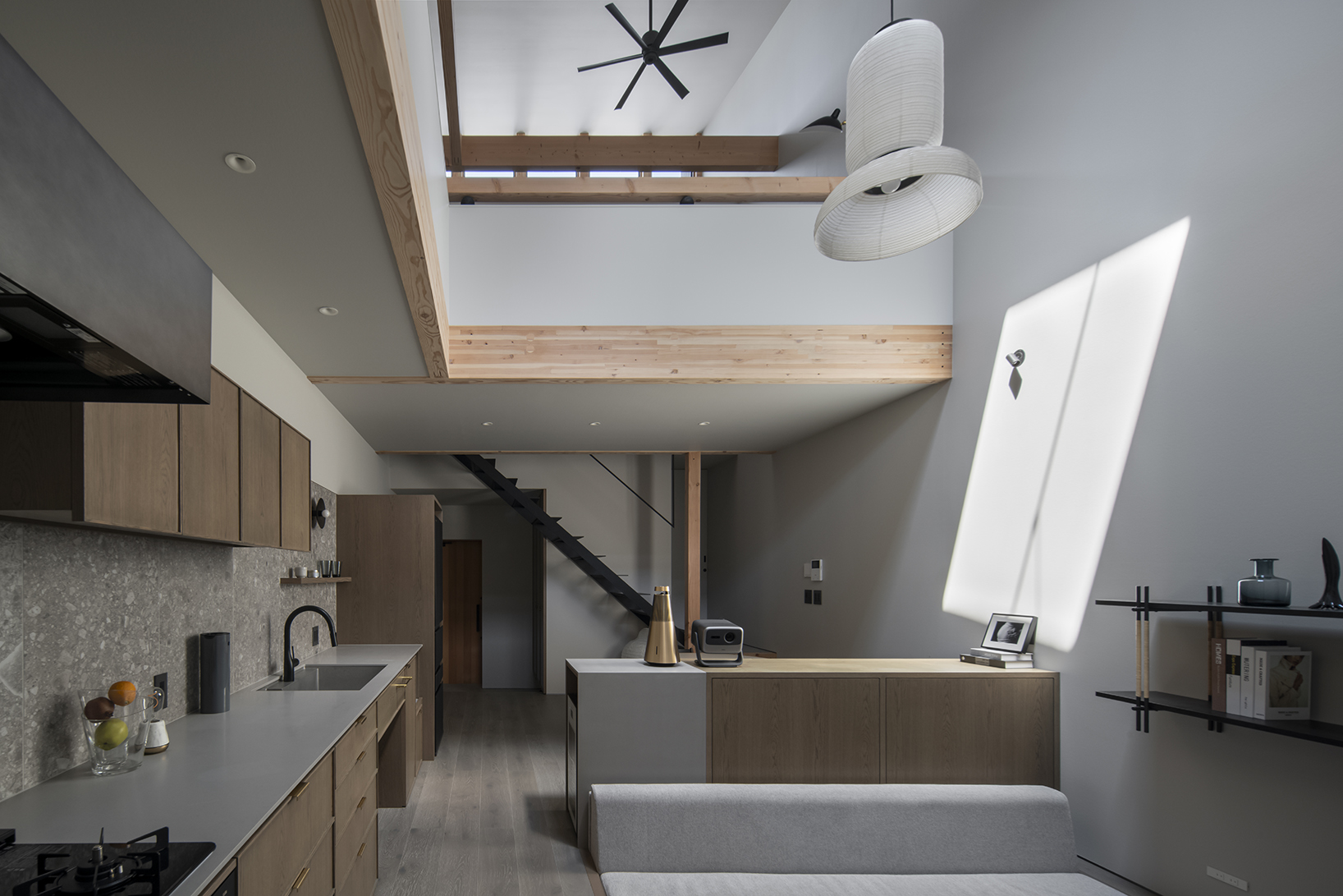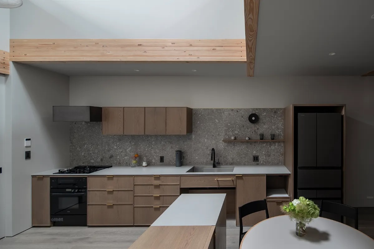 造作のキッチンはグレーと木の落ち着いたトーンでまとめ、アートやインテリアが自然に馴染む穏やかな表情に。プライバシーを守りながら、光と色を丁寧に扱うことで、コンパクトでも豊かな時間が流れるDLKが完成しました。