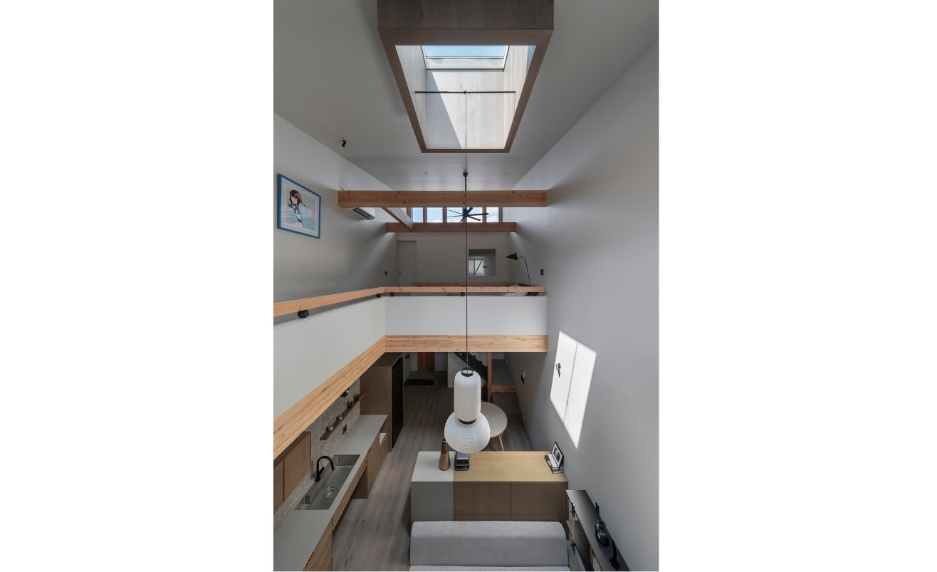 24坪という限られた面積ですが、DLKを中心に、和室と寝室を吹き抜け越しにつなぐことで、適度に区切られながらも視線の抜けと奥行きが感じられる構成に。空間を細かく仕切らず、必要な場所だけを最小限に囲うことで、家のどこにいても光や気配がやさしく伝わります。