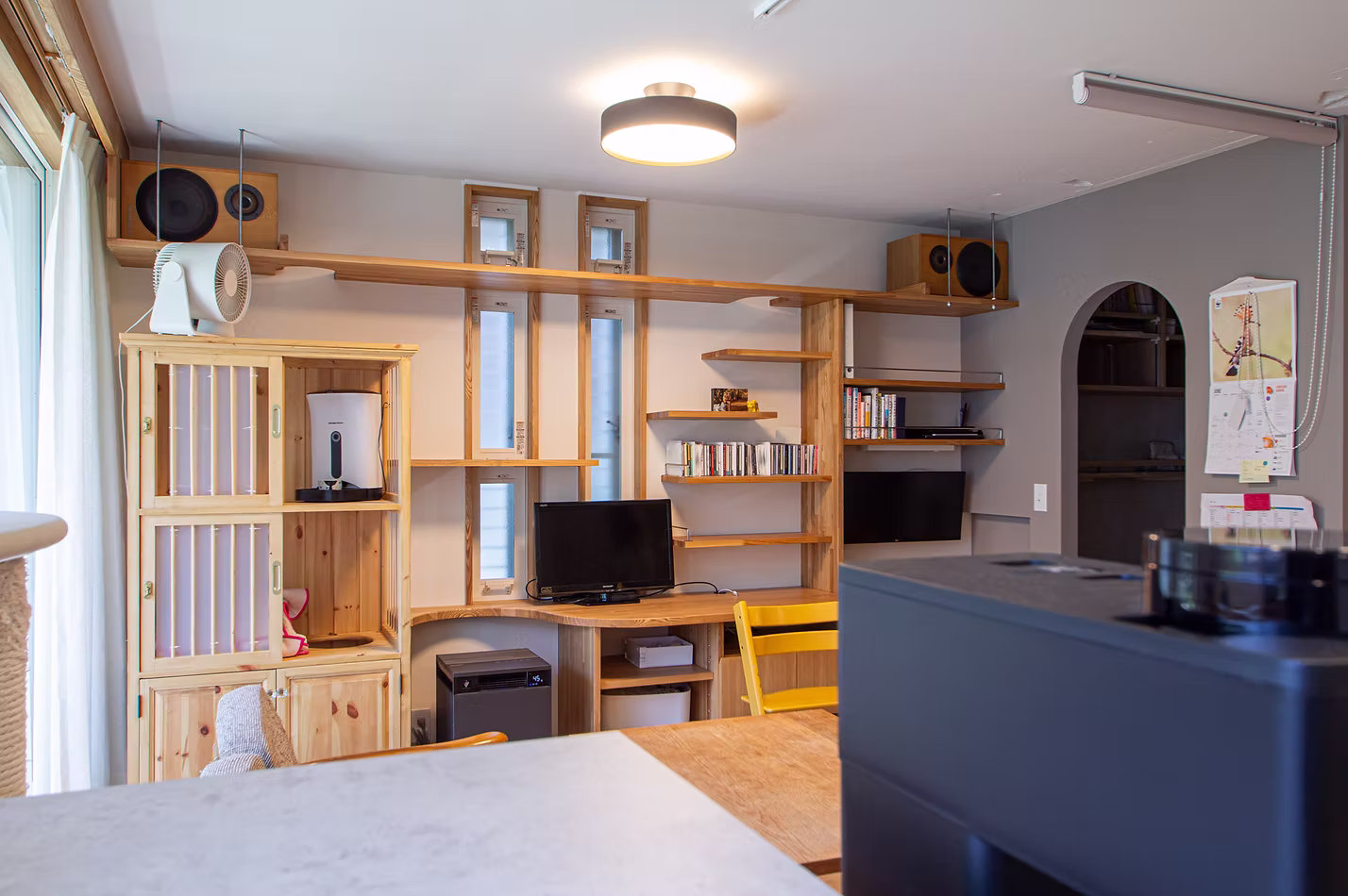 本棚でもありキャットタワーでもある造作家具は、用途を組み合わせたデザインに。棚の最上段はキャットウォークとして設えていますが、そこにスピーカーを置くことで、キャットウォークが日常の風景に自然と溶け込みます。