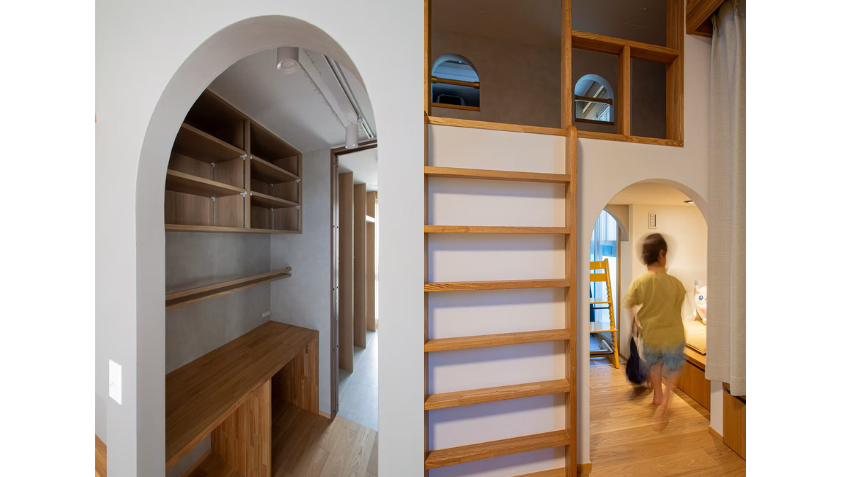 アーチ型の入口が特徴的なグレーの箱は、ぐるりと回遊できる設計で、スタディスペースからウォークインクローゼットへ、そして和室の小上がりへとつながります。