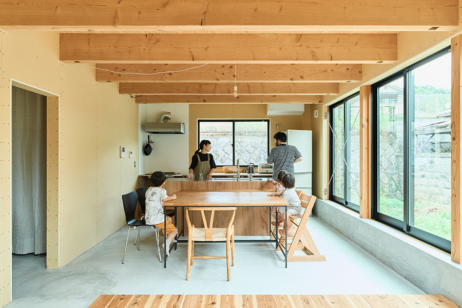 間取りについては廊下などをなくしてLDKに取り込み、リビングをできるだけ広くしました。庭側にはたくさんの窓を設けることで庭とリビングが繋がって感じられるように計画しました。