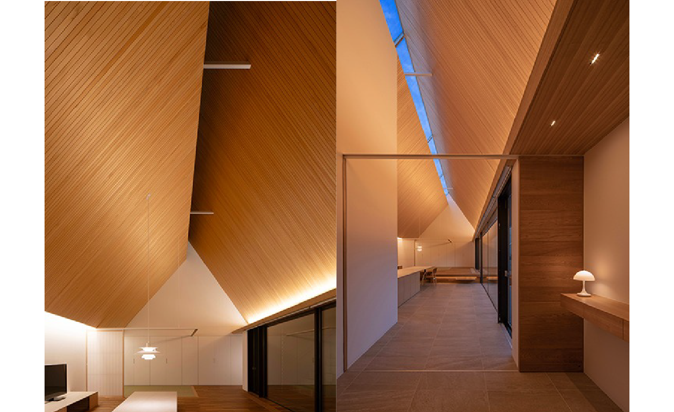 内部の印象を決定づけているのが、節のないヒノキを細かな目地で揃えた天井です。大きな一枚の面のように広がる上部には、北側の柔らかな光を落とすスリット状のトップライトを計画。