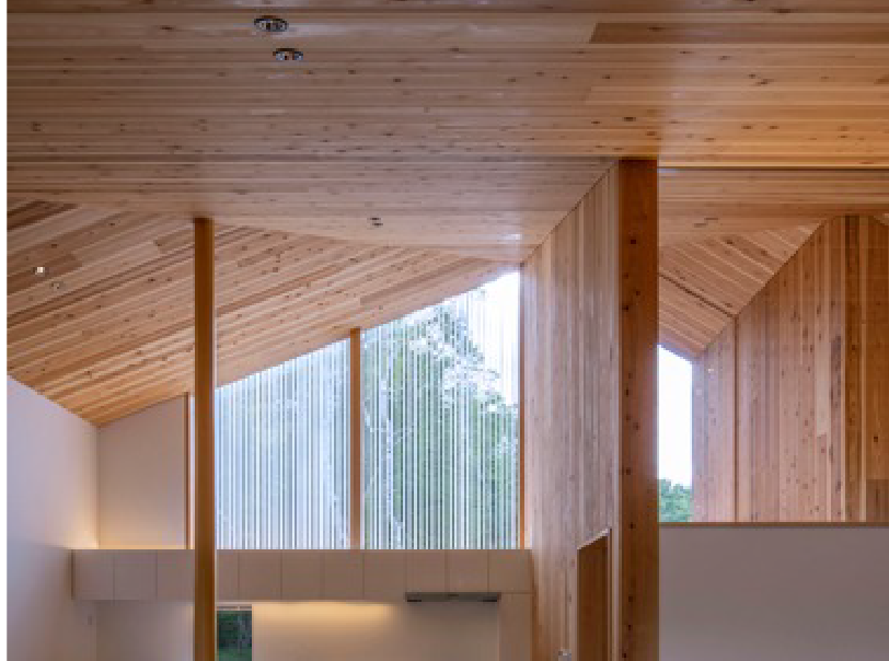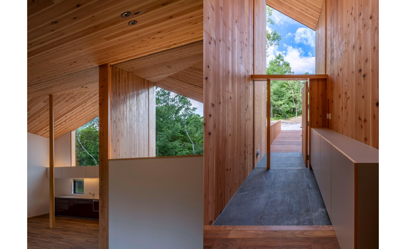 室内は玄関を入るとすぐにLDKが広がり、左右に寝室を分けたシンプルな間取り。過ごす時間そのものを静かに整えるため、内外装には地元の杉材を多く用い、天井にはヒノキを組み合わせています。白い壁と木の素材が重なり、森に抱かれるような落ち着きが空間全体に行き渡ります。