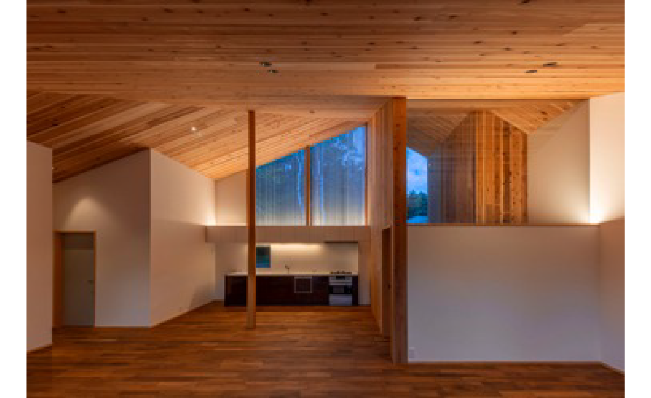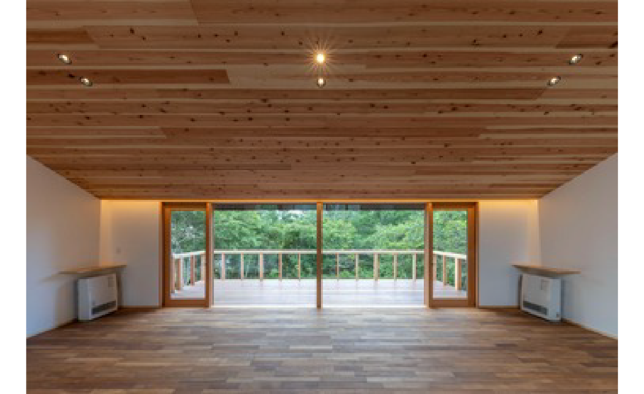 ここにあるのは、自然と距離を置くのではなく、距離を整えるための別荘。森の静けさと山の眺めがやわらかく暮らしに寄り添い、訪れる人の時間を穏やかにほどくような住まいとなっています。
