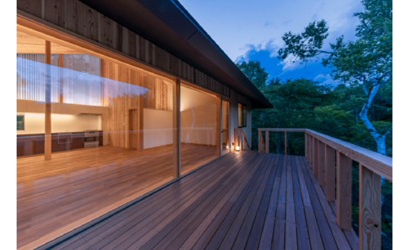 テラスデッキはあえて低い目線に設定し、外へ出ると森の中に身を沈めるような感覚が得られます。大開口と連続する構造により、室内に居ても外に居ても光の質が変わらず、季節や時間の移ろいがそのまま暮らしの背景になります。