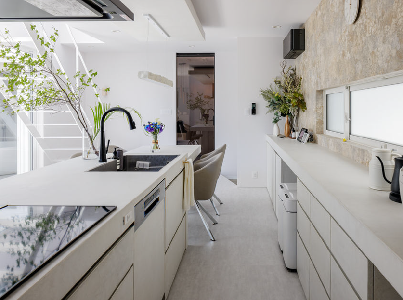 内部の中心となる吹き抜けリビングは、中庭の壁の高さを読み込み、十分に採光が落ちるように断面を調整。キッチン天板からバックカウンター、ダイニングテーブル、AVボードまで白いモールテックスで統一し、空間を貫く一体感を生み出しています。