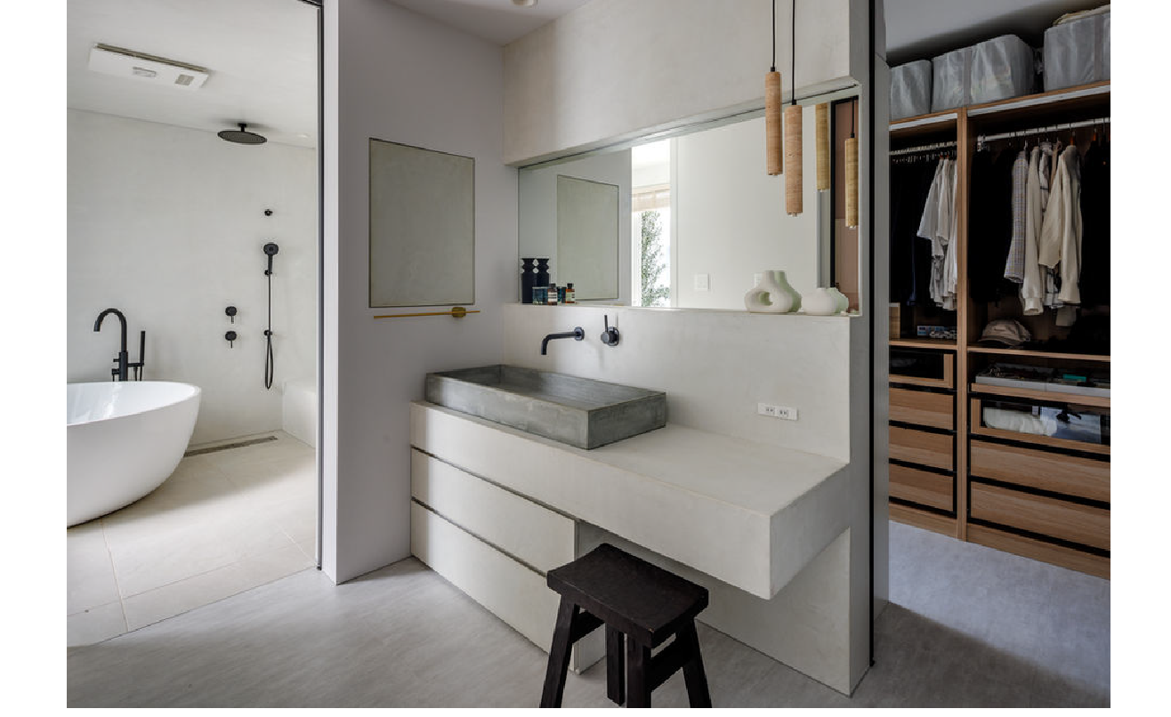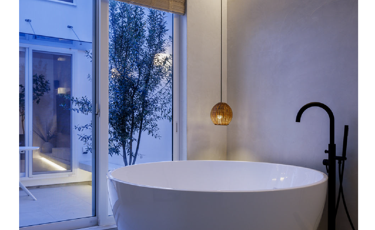 特徴的なのが4畳半の浴室。海外製の浴槽とモールテックスの壁天井を用い、中庭へそのままつながるように設計。間接照明が柔らかな陰影をつくり、イタリアやスペインの浴室空間を想起させる静かな空気が漂います。