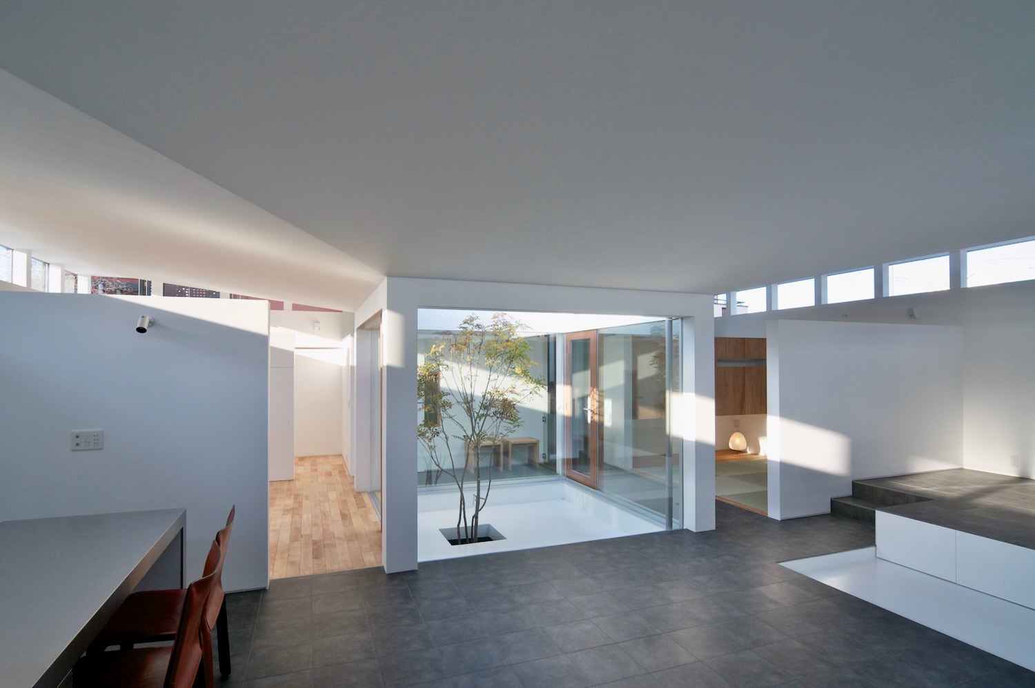 特徴的なのは、建物を支える構造体を外周部と中庭を囲む4本の柱だけに限定した点です。室内の壁はすべて途中で止められ、天井まで届かないため、空間がひとつにつながる開放的な印象をつくり出しています。外側には構造体が見えないため、ぐるりと360度を窓が囲うような構成となり、どこにいても均一で柔らかな光が入る空間が生まれました。