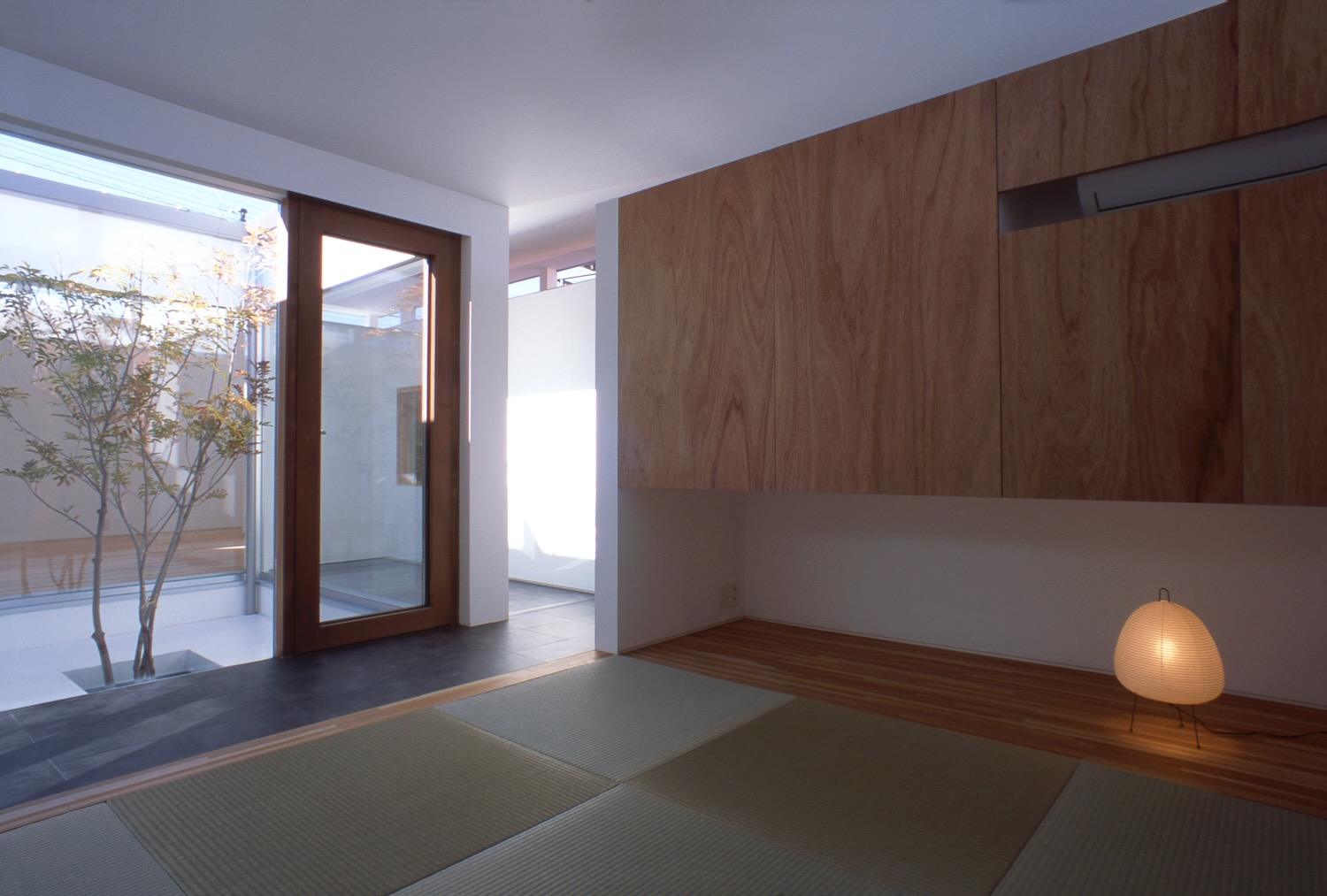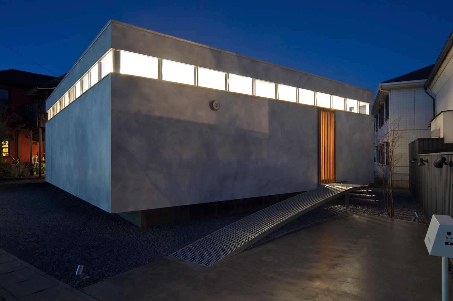 建物自体はコンクリートの台の上に木造の箱をのせるような形式とし、床を60cmほど上げて浮遊感のある佇まいとしています。斜めに振ったボリュームが生み出す余白は、用途を限定しない“なにもないスペース”として、住む人の感性によって自由に育てられる場所になっています。