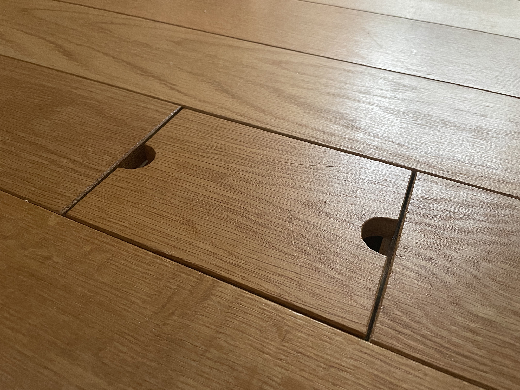 この家では窓からのコールドドラフト(冬場に外の冷気が窓ガラスを伝わって室内に流れ込み、足元が冷える現象)を防ぐため、窓辺に温水ファンコンベクターを設置しようと考えました。居間の収納と合わせて、窓辺を木のカウンターにして、その下に暖房の本体を隠しています。稼働時には前面のルーバーを開けて使用できます。操作パネルは普段はカウンターに隠れていますが、一部がふた状に取り外せられ、冬の使用時には開けて操作できます。存在感が出てしまいがちな暖房設備もすっきりと空間になじませる工夫です。