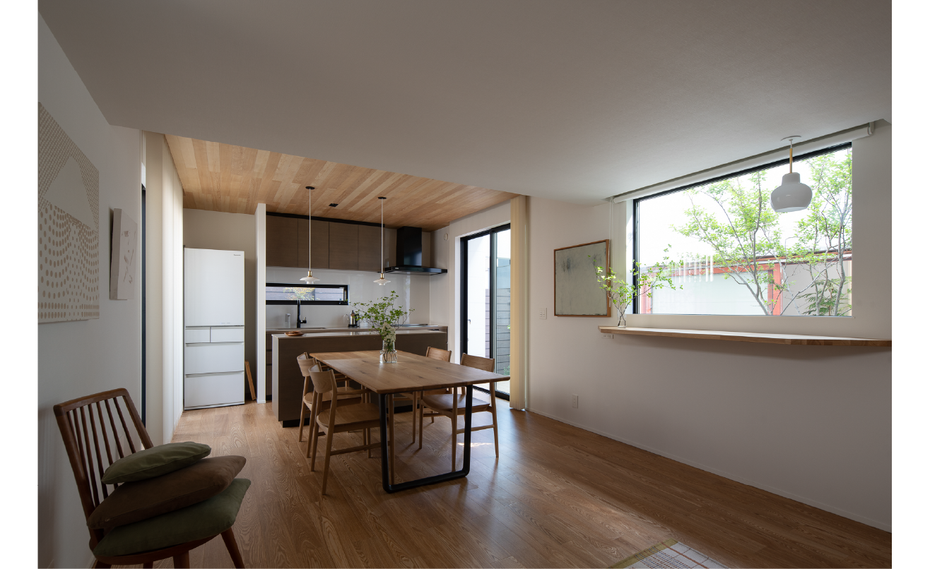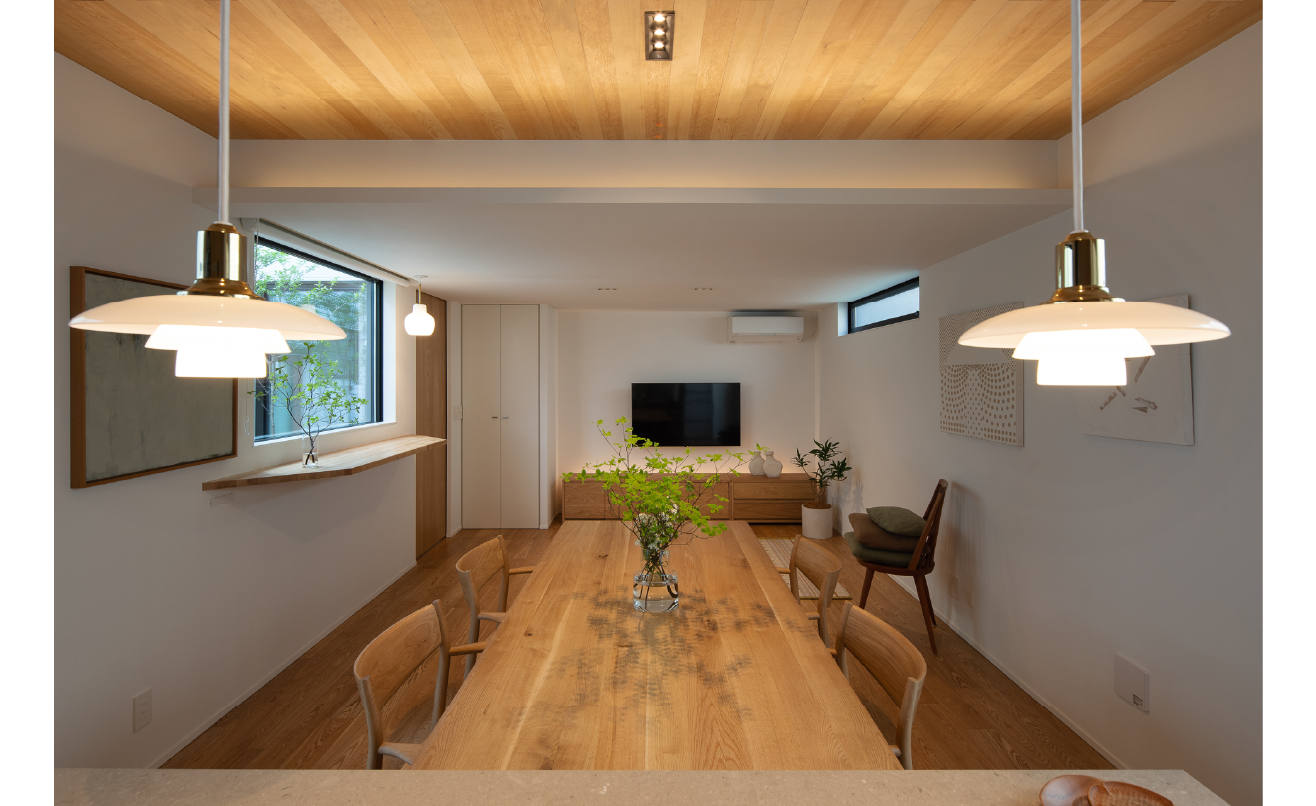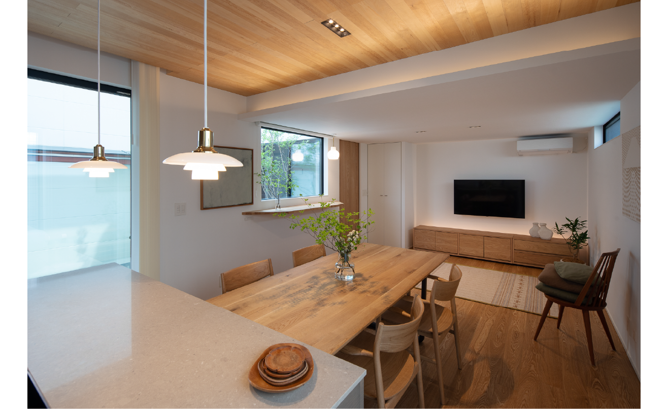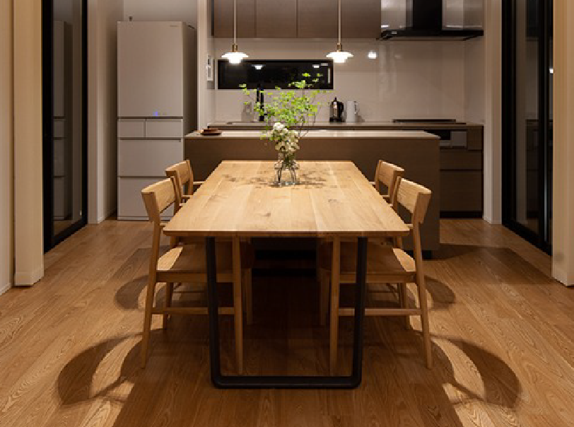 中心となるダイニングとキッチンは素材とプロポーションの整え方によって、空間そのものが連続する居場所として立ち上がっています。テーブルやチェア、そしてキッチン本体に至るまで、国産ナラ材やタモ材を使い、素材の表情をそのまま空間に開くことを選んでいます。
