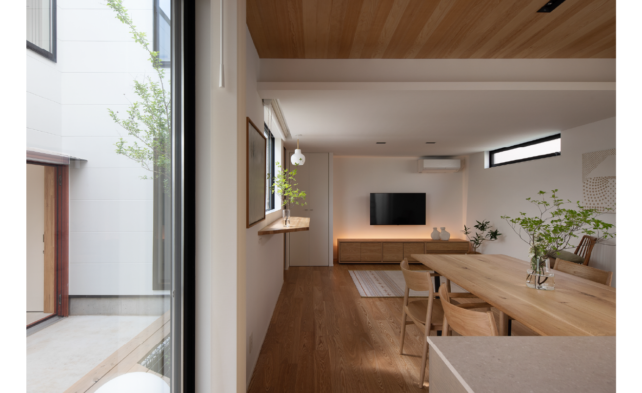 さらに、このLDKの心地よさを決定づけているのが中庭との関係。玄関側から外へひらけ、中庭を通って北側の裏庭へと視線が抜ける構成によって、室内は常に外の気配と共にあります。
