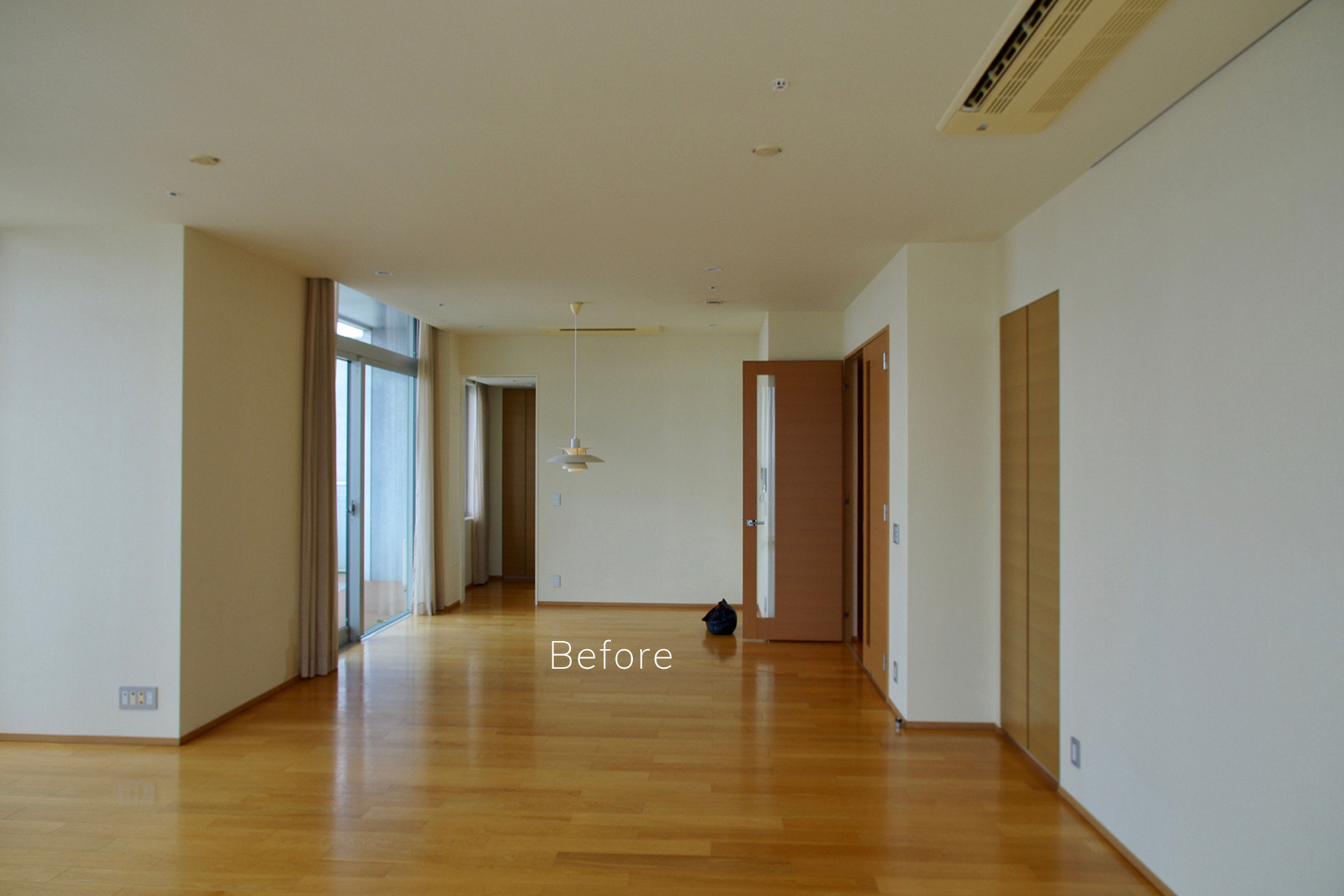 このリノベーションでは、間取りや建具、天井高さなど空間的な問題はほとんどなく、素材感が課題点でした。そこで床や壁、天井などを取り払う形ではなく、既存の物の上から壁や天井はプラスターボードを増し貼りし、ビニルクロスではなく塗装仕上げにしました。床も既存の物の上にフローリングを増し貼りしています。それによって工期とコストがかなり抑えられました。