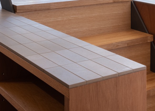 たとえば、ダイニングから一段上がったリビングは、段差がベンチとしても機能します。 リビングには掘りごたつ風の書斎スペースを設置。ダイニングからは死角になるため、視線が外れ、自然と集中できる場所になっています。