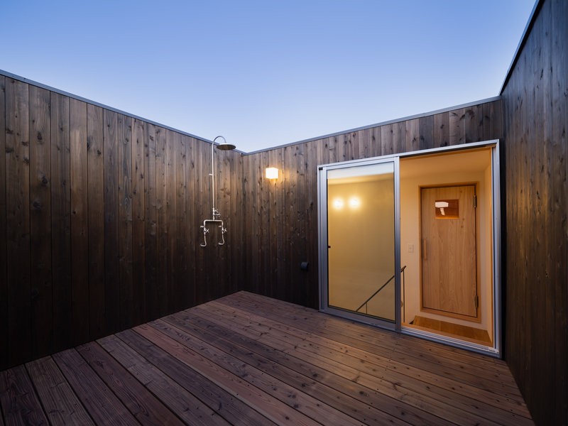 リビングからつながるテラスや屋上を、「外」ではなく「屋根のない部屋」として考えました。リビングからテラスはシームレスにつなぎ、リビングルームの延長として。屋上は、サウナルームからつながる部屋として、全面を木で囲うことで、室内のように気負わず使える場所としました。