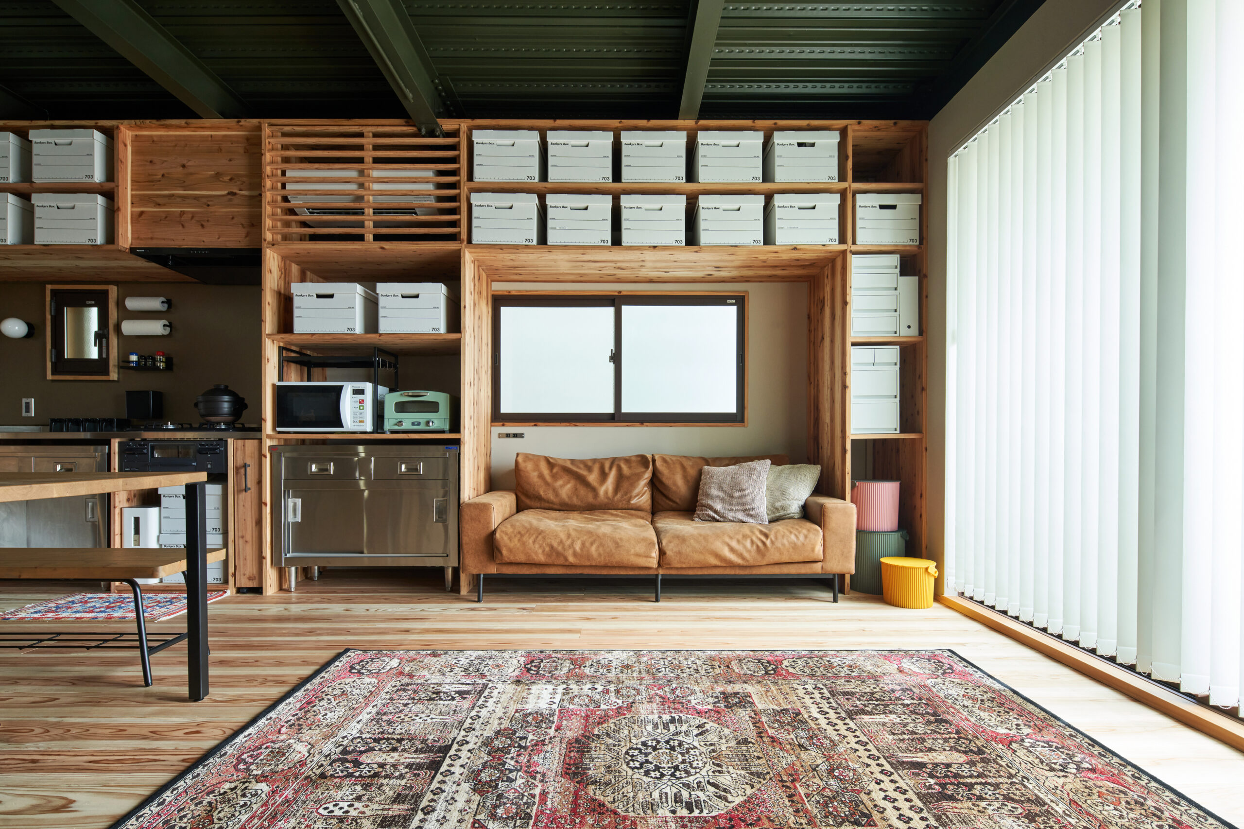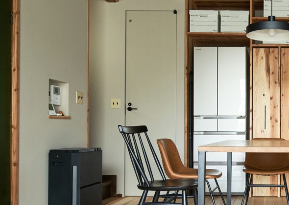 そこで、利便性・機能性・見た目の美しさのバランスを検討し、杉の集成材で造作した収納棚をキッチンからリビングへと連続させ、一体的な壁面収納として計画。お子さんが生まれたばかりの時期は、細かく仕切るよりも大きくまとめられる収納のほうが便利な場合も多いため、市販のボックスが収まるサイズで造作することで、その時々の暮らしに合わせて柔軟に使い方を変えられるようにしています。