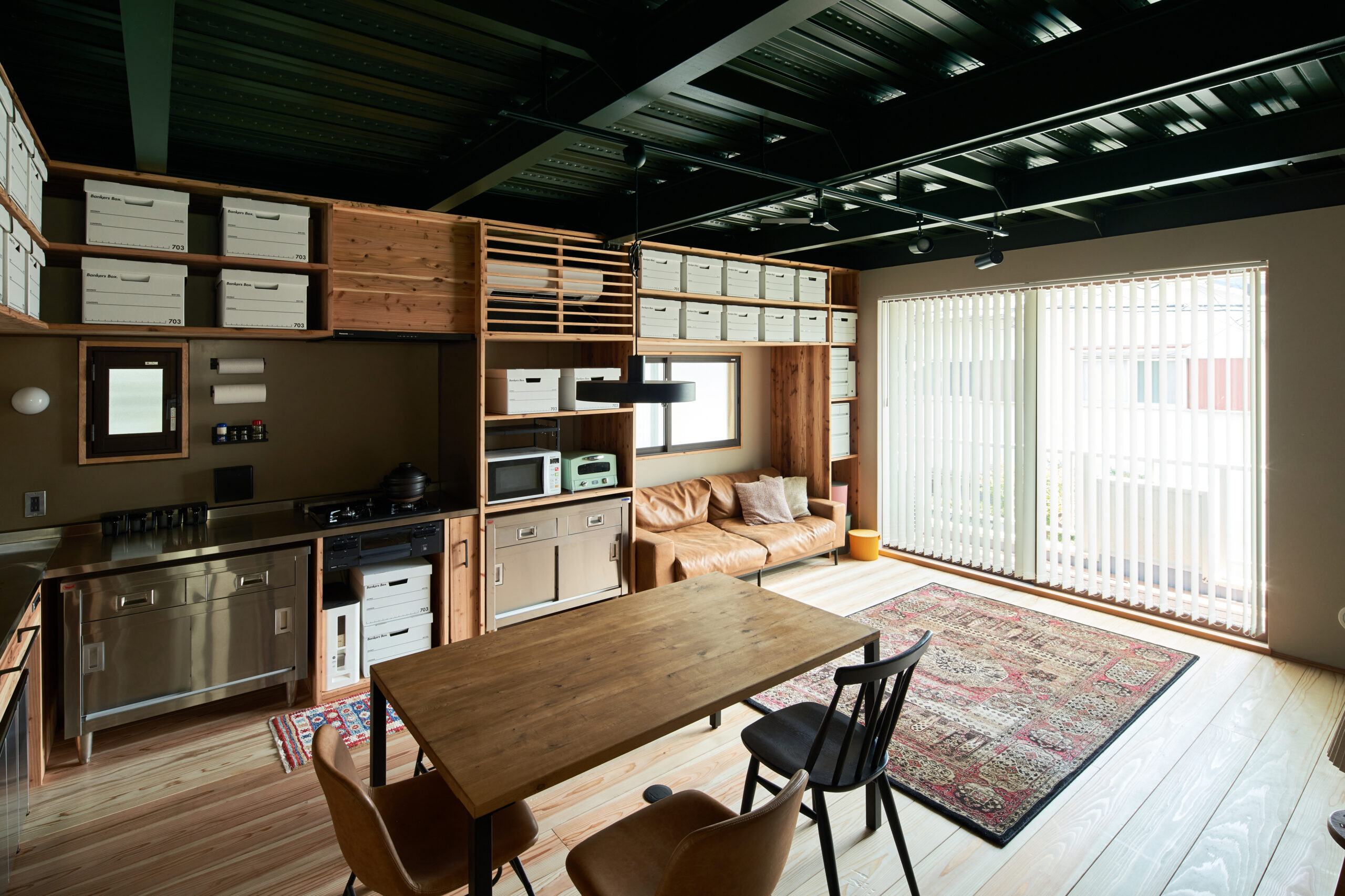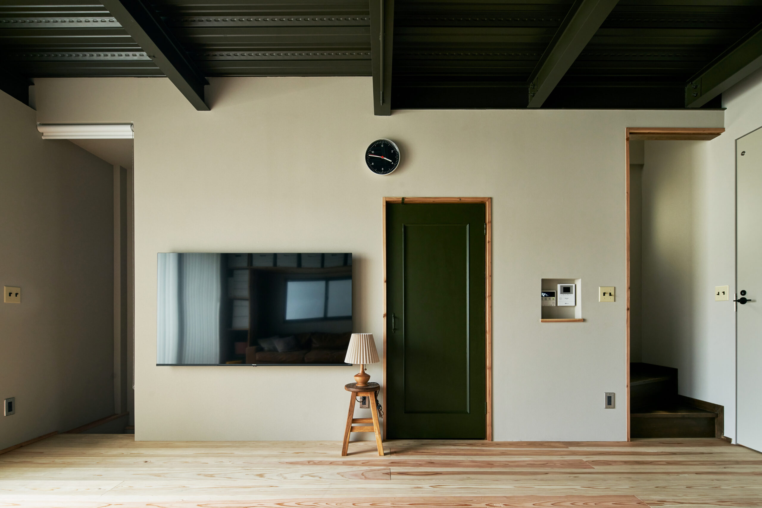 天井はすべて表しとし、カーキ色に塗装。造作棚には無骨な雰囲気が似合う杉の集成材を採用しました。床には節のない約30mmと厚みのある杉のフローリングを用いることで、造作棚に使った杉の節が際立ち、ワイルドな印象を引き立てながら、上質さも与えてくれます。