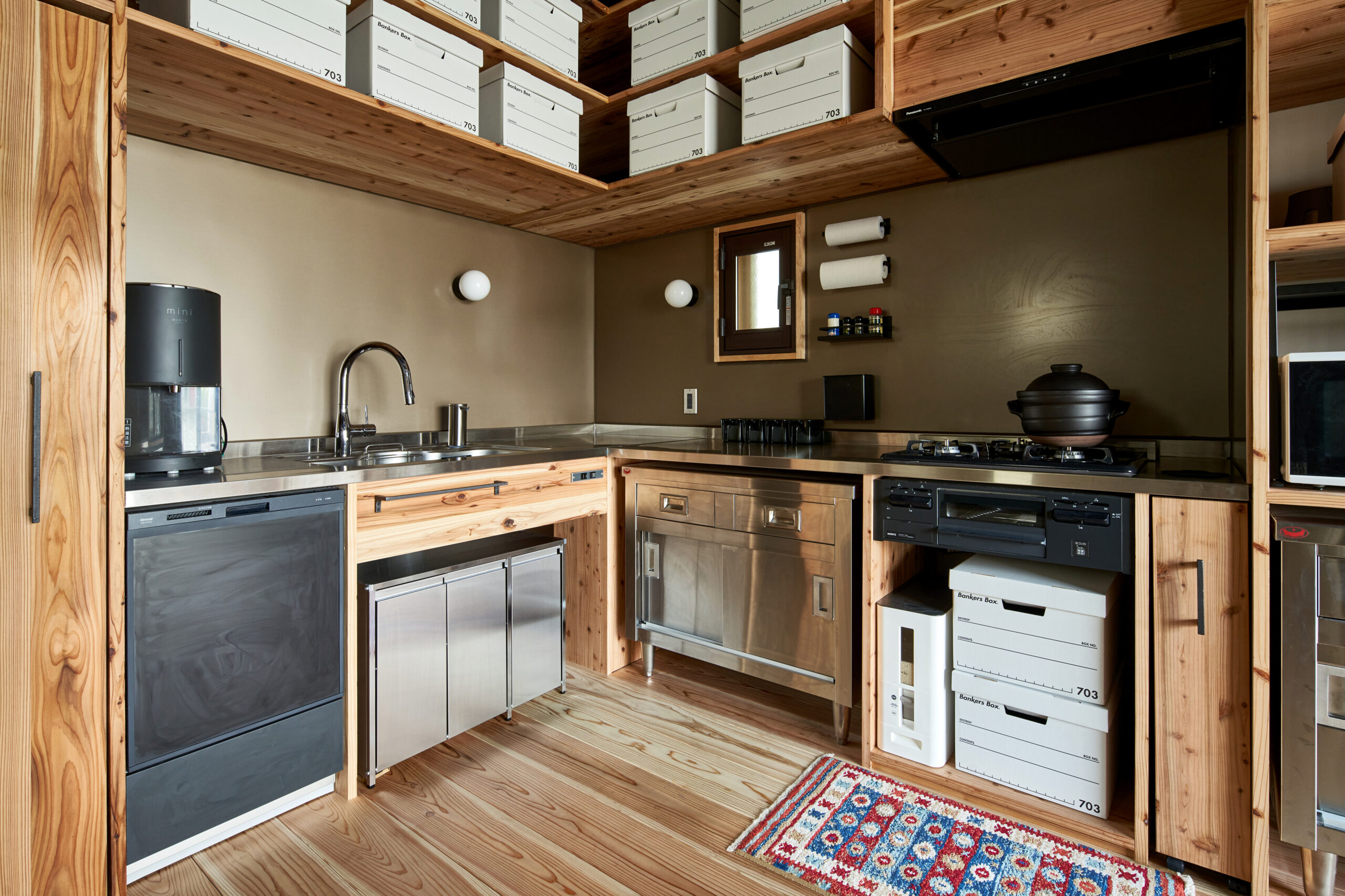 「厨房メーカーのキッチンは使いやすい」というご主人の話がヒントとなり、厨房メーカーのステンレス製天板を作業台として採用したキッチンを造作。既製品を組み合わせてキッチンを造作することでコストが抑えられ、空間にもシンデレラフィットしています。