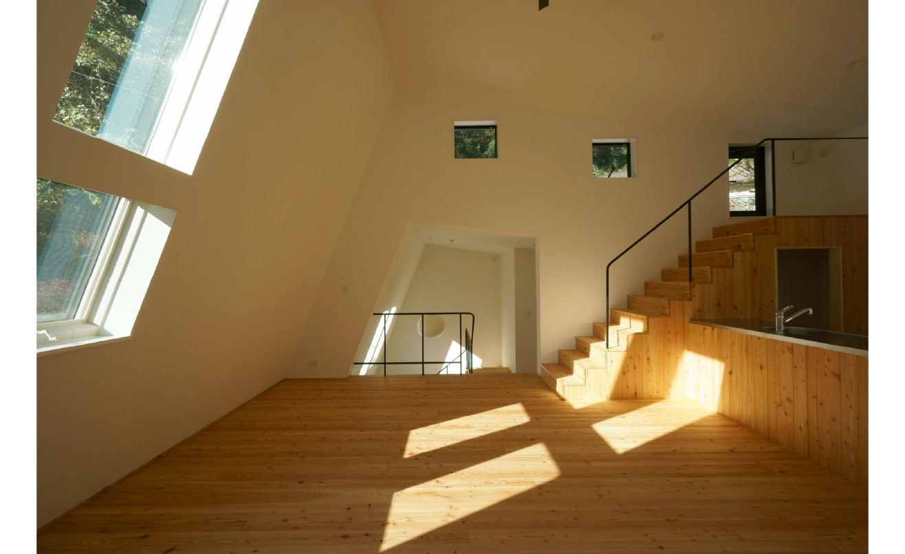 2階のメイン空間を東側に配置し、西側よりも高く設定することで、周囲からの光を効率的に取り込むと同時に、用途に応じた居場所を生み出しています。スキップフロアのようでありながら明確な階分けをしない構成は、平面・断面の双方に広がりをもつシークエンスをつくり出しているのです。
