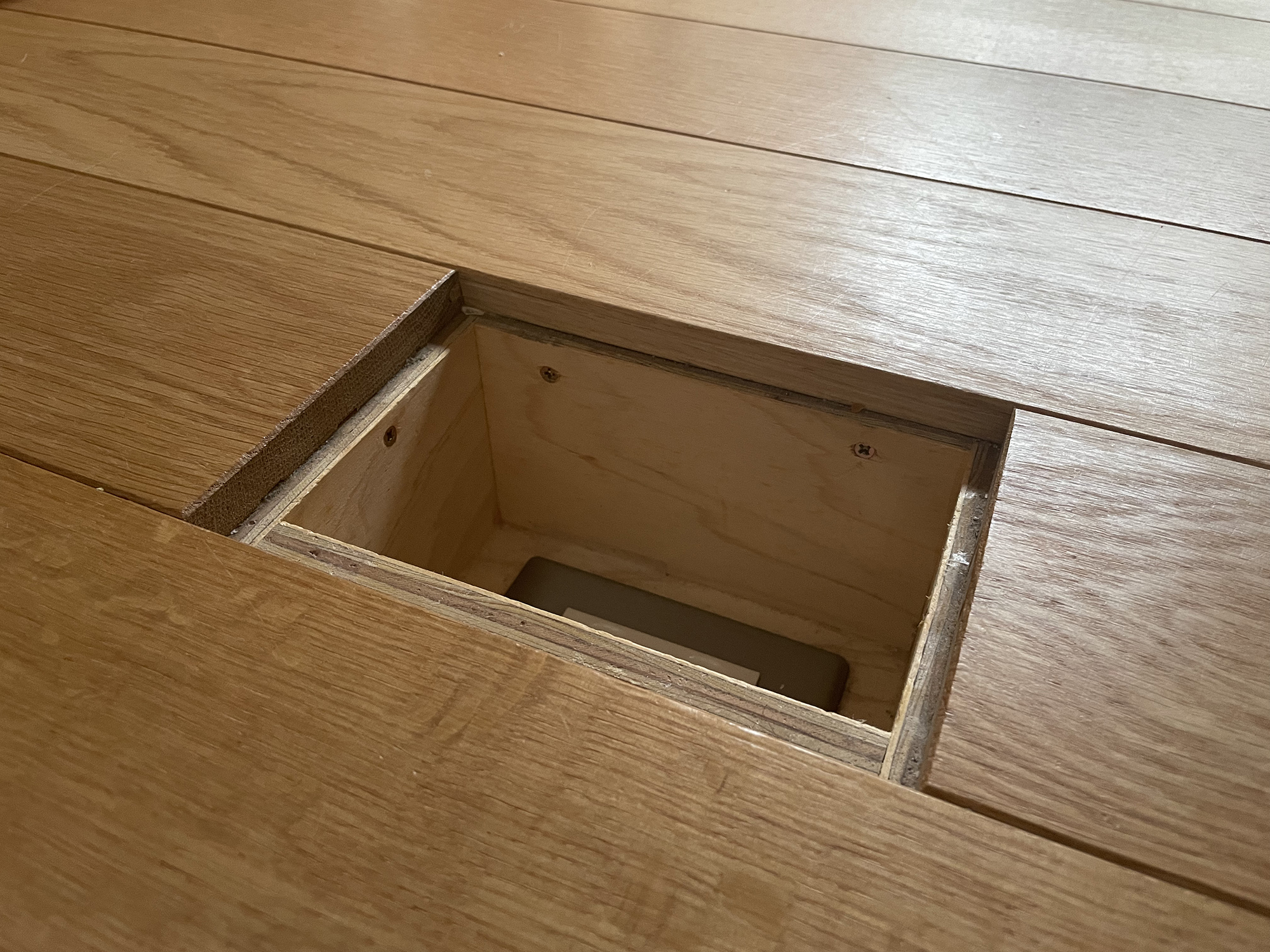 生活の中で、家電の電源やガジェットの充電、と、あちこちで必要なコンセント。部屋の端にしかないと長いコードが部屋をズルズル走って邪魔になります。かといって床用コンセントをフローリング上に設置すると今度は出っぱったり、見た目も気になります。そんな悩みを解決するための素朴な工夫です。写真のようにフローリングの一部をふた状にカットして床の下を箱型にし、コンセントを隠しています。使わない時は蓋をすれば周りのフローリングとなじんで段差もでないので、見た目がスッキリしますし、足元も引っ掛かったりせず安心です。設計の中で、フローリングは木のもつ暖かさや柔らかさを感じられる無垢材にすることが多いので、このように蓋をくり抜いた形にしても断面も違和感なくきれいなものになります。唯一気になる点としては、我が家(『高津の家』)もですが、蓋を開けると高確率で小さい子供が中におもちゃを隠して遊んでいたりすることです(笑)