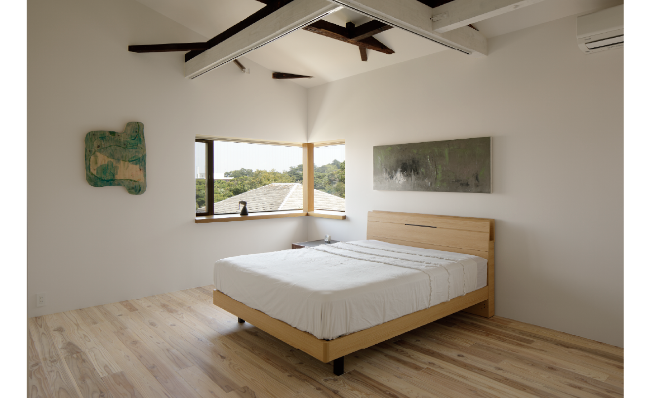 構造梁をあらわにした天井と、白い床、最低限の家具構成。視線を受け止める壁と、外へと抜ける窓が、意識を静かに切り替えてくれます。