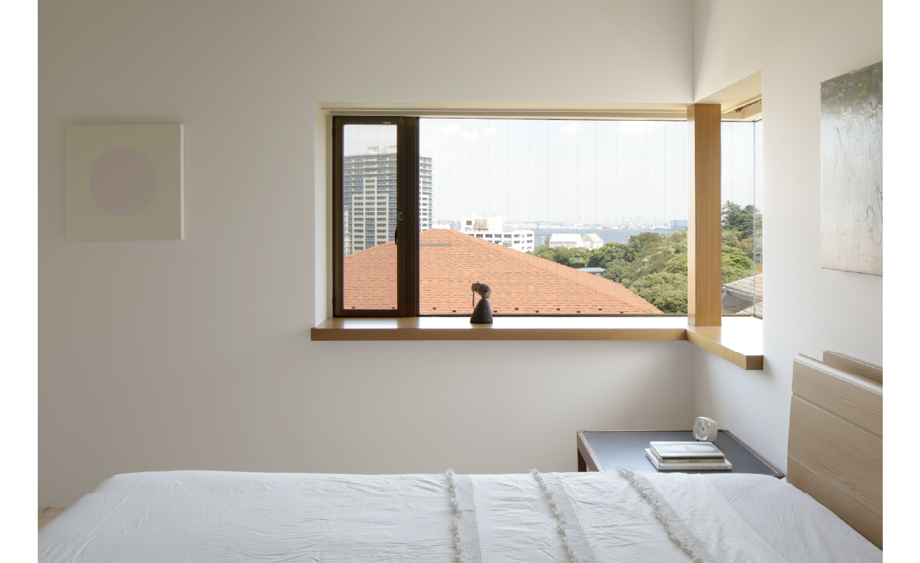 またL字に切り取られた出窓からは、公園の緑とその先に海を望む景色が広がります。山手という立地の中で得難いこの眺めは、作品や空間と同じく、住まいの一部として日常に溶け込んでいます。