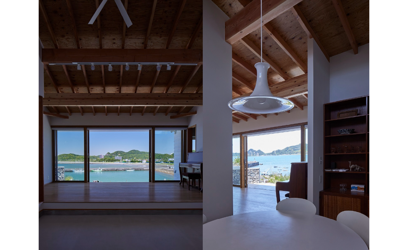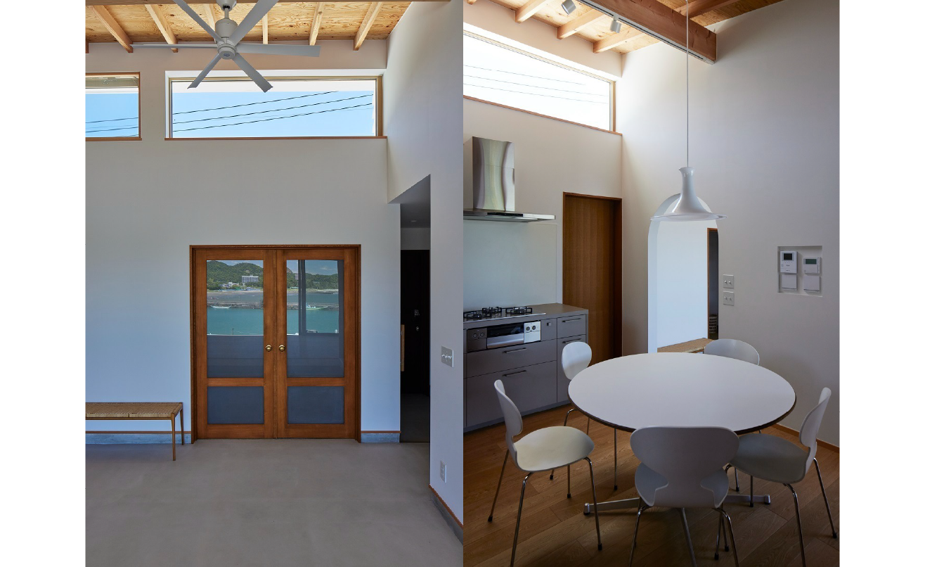 その代わりに北側にはテラスと連続する大開口を設け、室内にいながら海と空の広がりを正面から受け止める構成としています。一方、南側からはトップサイドライトによって光を取り込み安定した明るさを確保しています。