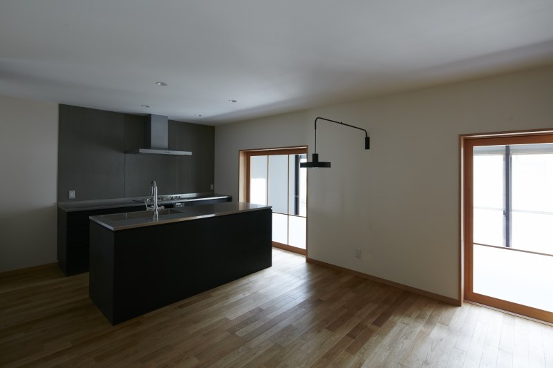 もともと中庭として構想されていたこの場所は、屋根をかけて内部化することで、リビングを拡張し、内外をつなぐ中間領域として再解釈されました。