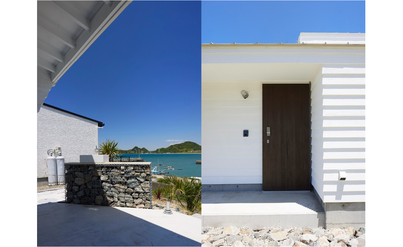 外観は白を基調としたシンプルな構えとし、周囲の景観に静かに馴染ませています。開口を抑えた道路側と海へ向けて開かれたリビング。その対比がこの家で過ごす時間の質をより際立たせています。