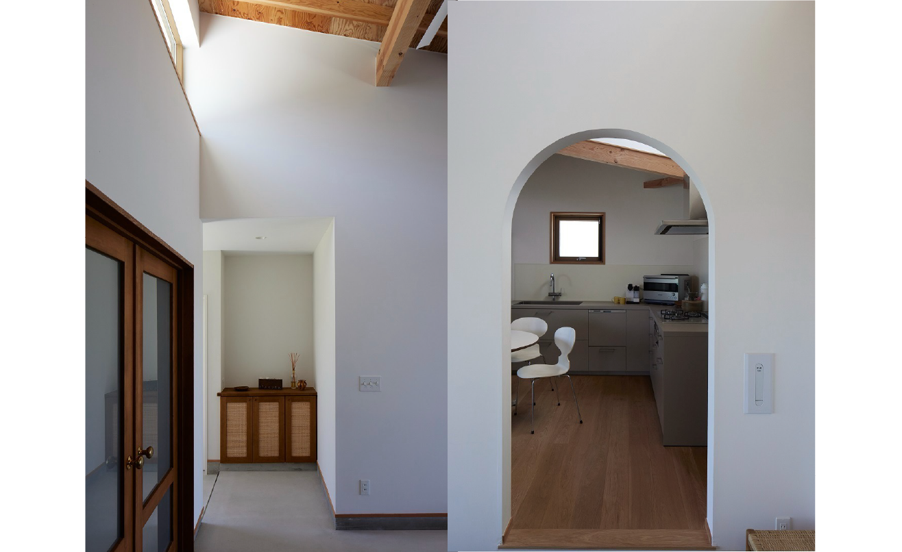 リビングにはアーチ状の開口が設けられダイニングキッチンへと柔らかく繋がっています。用途の異なる空間を明確に分けるのではなく、素材と形で緩やかに切り替えることで、動線そのものが心地よい体験となっています。