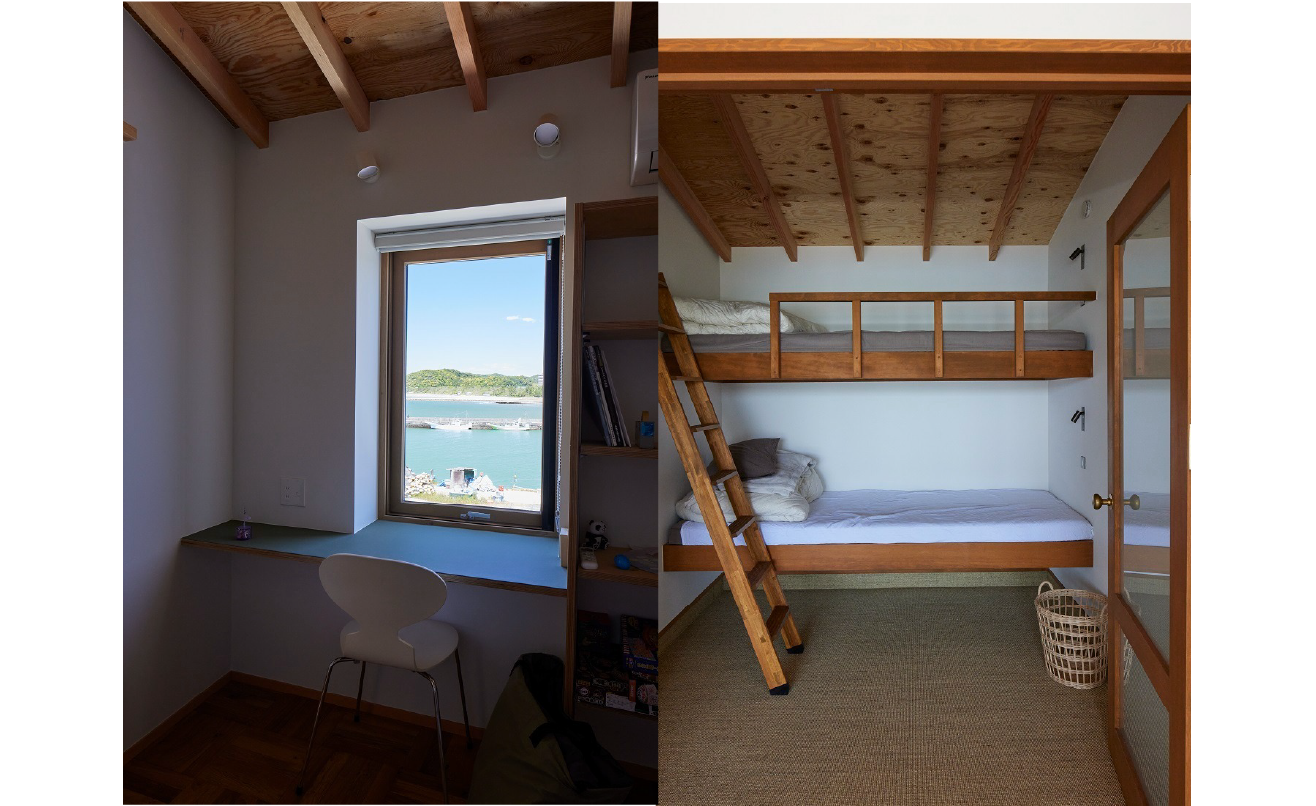 内部に目を向けると、ゲストルームには上下に展開した造作ベッドが設けられ、限られた空間を存分に使っています。友人家族が泊まりに来た際には、子どもたちが上下段を選びながら楽しむ姿が広がるそう。天井には架構をそのまま表し、コンパクトな部屋に過度な閉塞感を与えない工夫も施されています。
