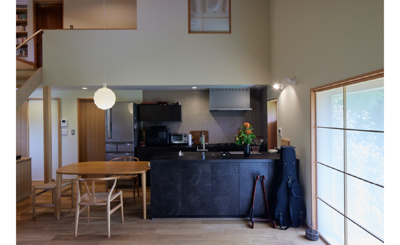 キッチンは家具の一部として空間に溶け込ませることで、和の設えとの調和を図っています。用途の異なる要素が同じ文脈の中で受け止められています。