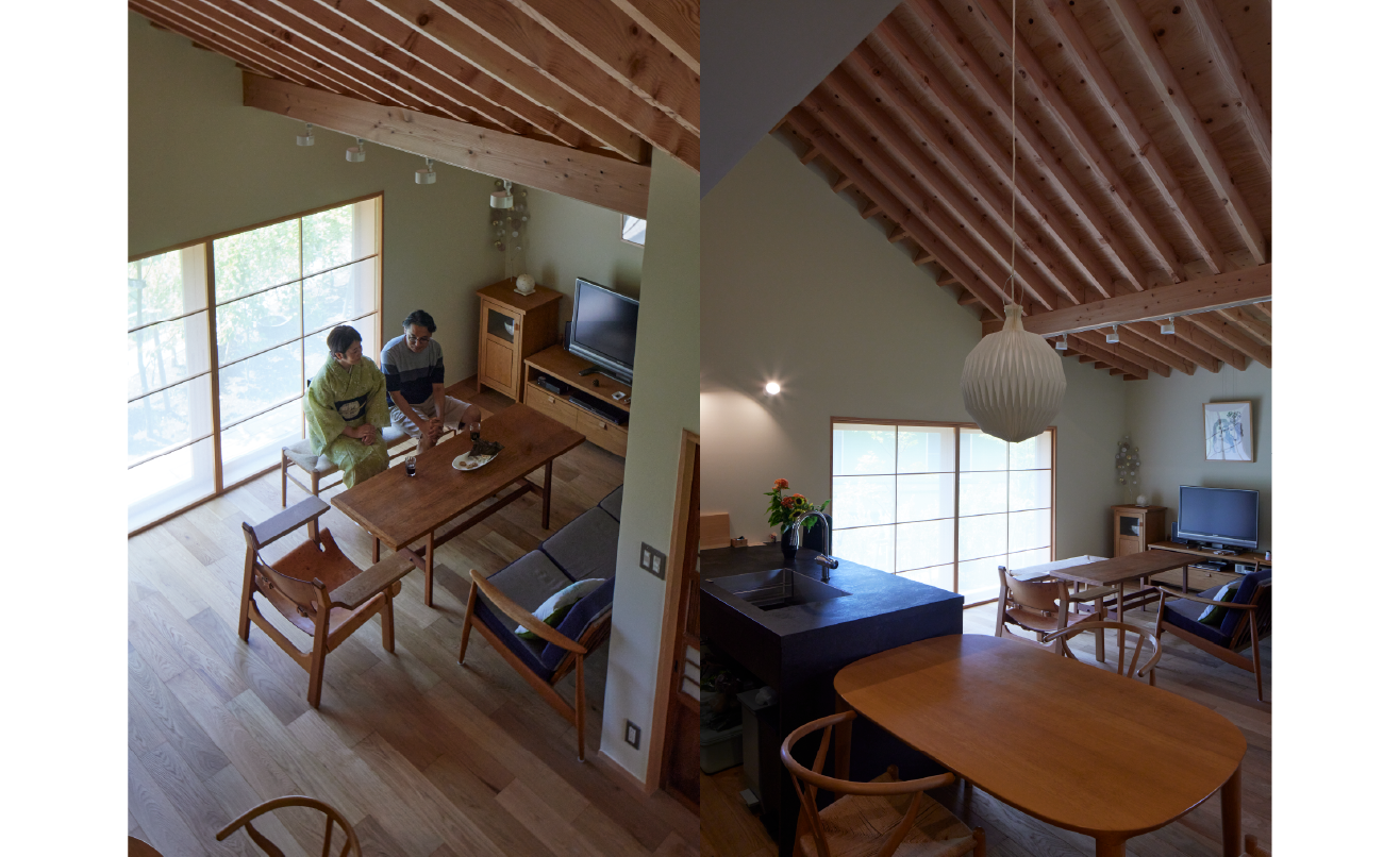 空間の骨格をつくるのは建具屋による木製建具の構成。多くの建具や造作は既製品に頼らず、空間ごとに丁寧に設えています。天井は仕上げで覆い隠すことなく架構を表し、梁や垂木そのものを意匠として見せ、素材の表情を空間の質として受け止める姿勢が住まい全体に一貫しています。