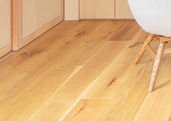 2階のLDKでは、エアコンが壁や収納棚と一体に見えるよう、壁と同じ色味の板を1枚設け、存在感を消しています。