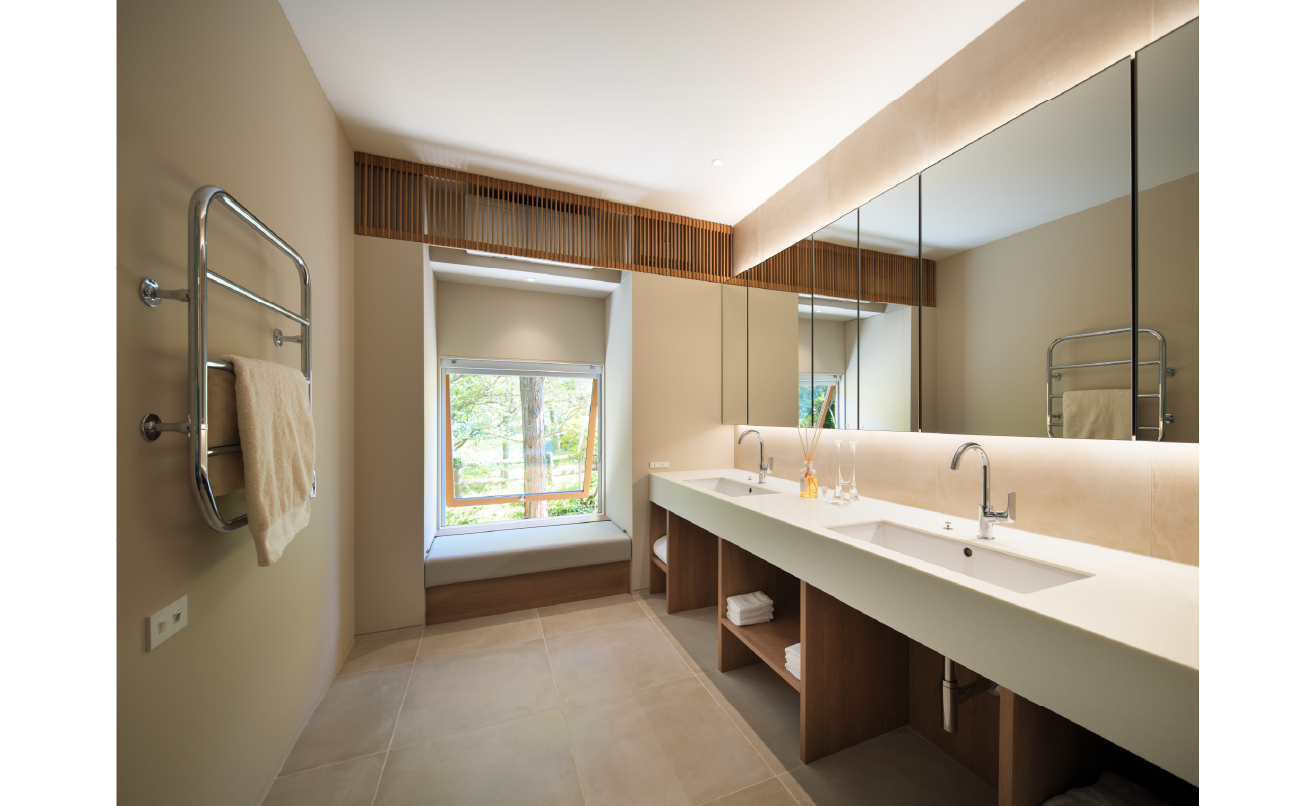 温泉を備えた洗面・浴室まわりには、一枚物の造作の洗面台と三面鏡を採用。入浴後に腰掛けられるベンチやタオルウォーマーを設え、身体を労わる動線を丁寧に整えています。大きな開口からは緑を望み、室内にいながら自然と呼吸が合っていきます。