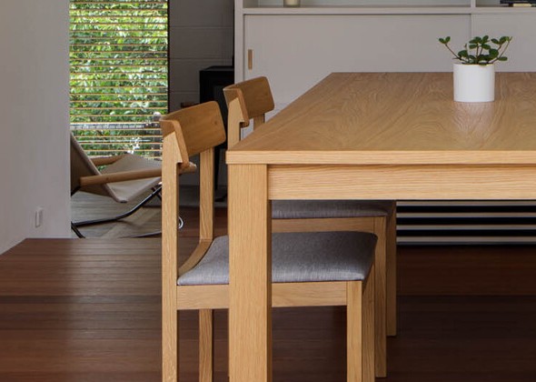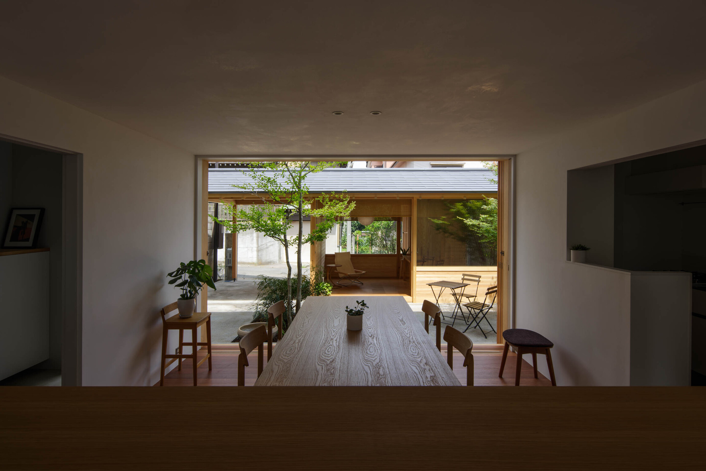 一方、離れはフレキシブルなスペースとして、木とガラスで構成した軽快でシンプルな空間としました。、将来的には地域に開いたコミュニティの場になったりと、時間とともに役割が変わっていくことを想定しています。
