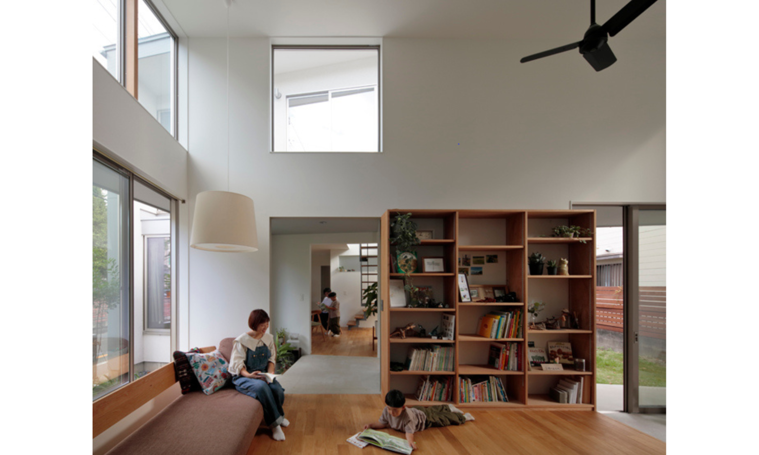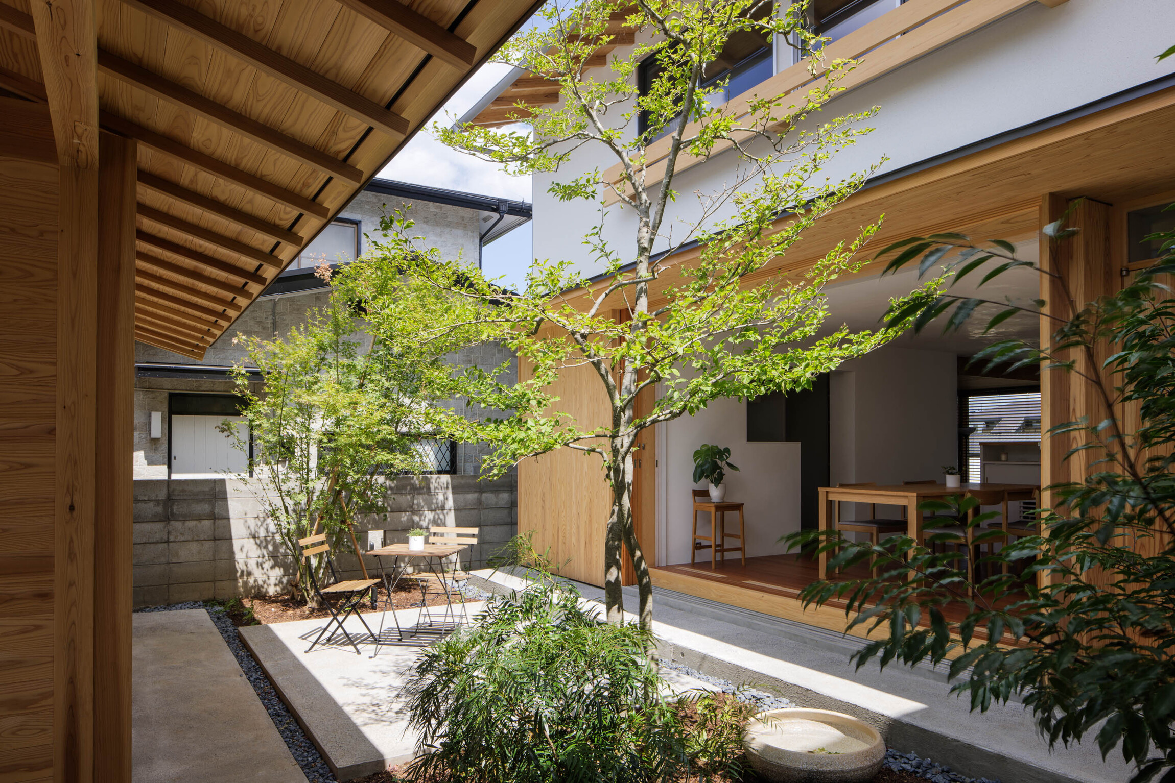 駅に近く住宅が立ち並ぶ環境のなか、道路側に離れを設け、主屋を敷地の奥へ配置することで、プライバシーを確保しながらも、大きく開いた暮らしが実現しました。