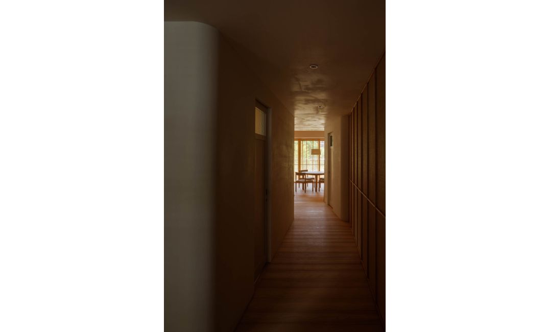 暮らしの中心になる主屋は、断熱性能を高めた重厚な空間に。床には無垢のフローリング、天井と壁には漆喰の小手塗りで仕上げ、反射する光のやわらかい質感を大切にしています。