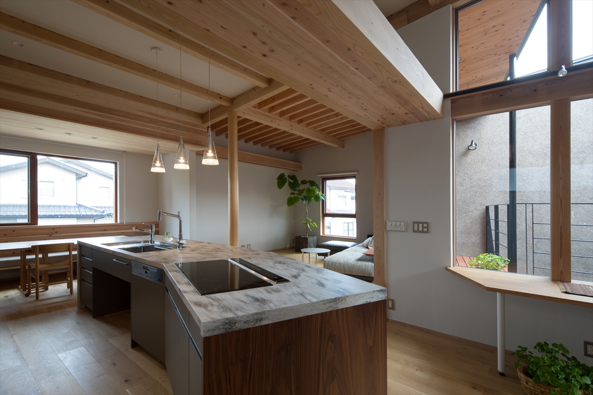 2階のLDKのV型のキッチンは、この住まいの特徴のひとつです。