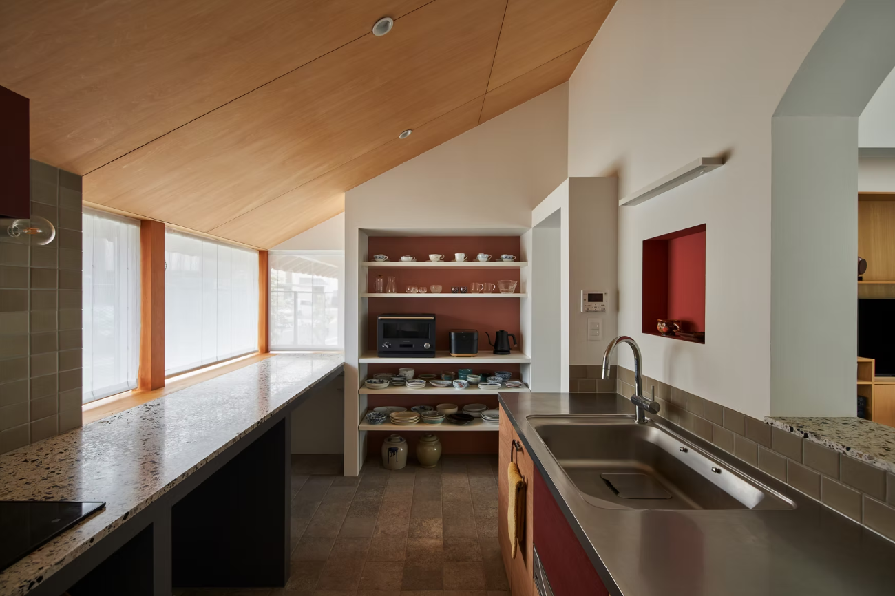 例えば、瓦の赤茶色をキッチンのニッチやレンジフードカバー、ダイニング照明のカバーに採用。外と中がリンクするデザインに。重要なアクセントとしてリンクされています。