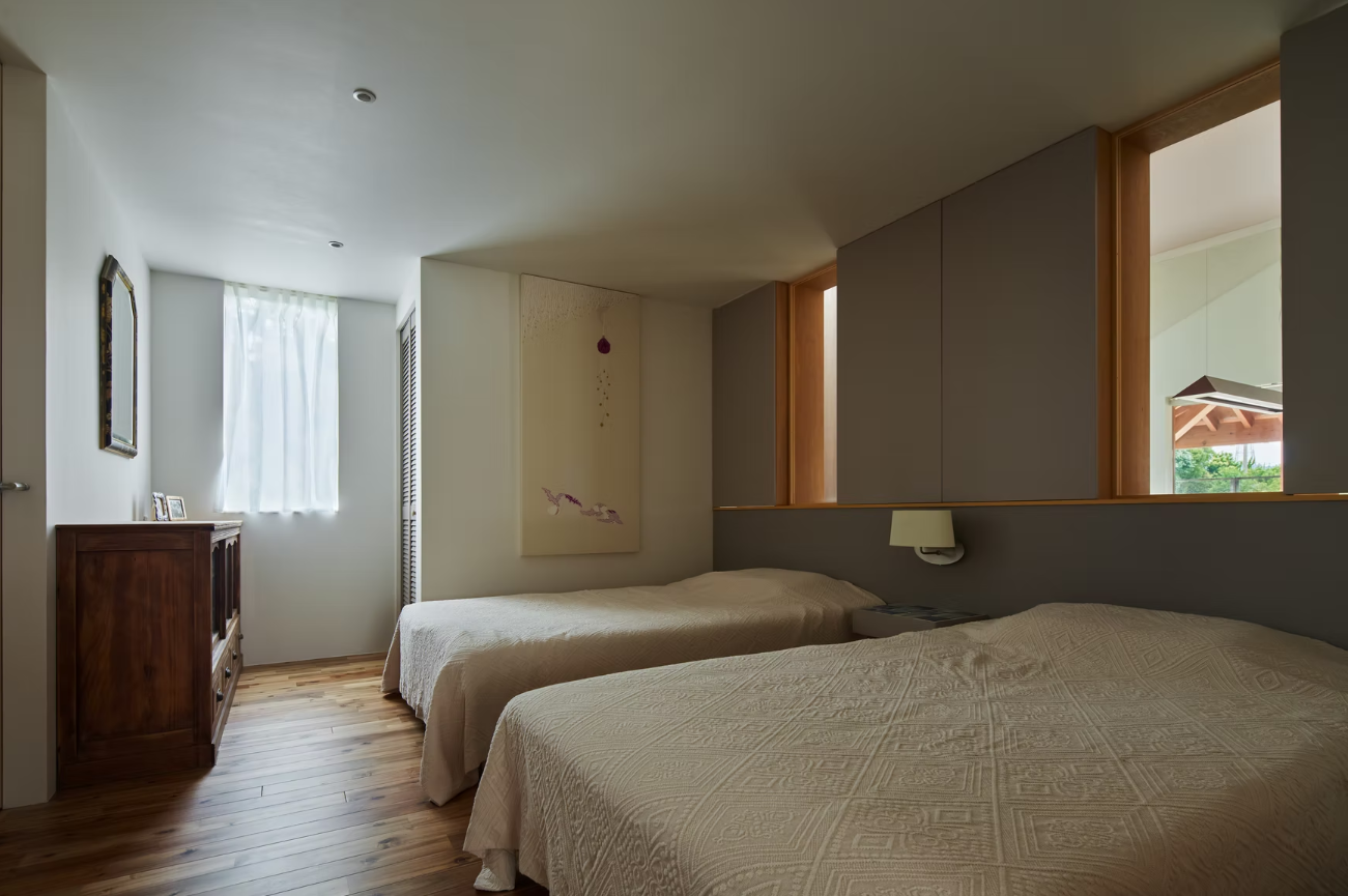 寝室はリビングのすぐ横に設け、キッチンは独立性を持たせながらも大きな開口を設けて視線が抜けるデザインにするなど、明確な仕切りを作らず見通しのきく距離感を大切にしています。