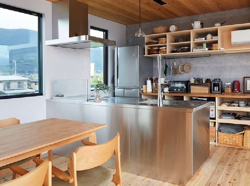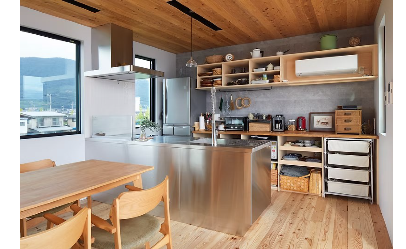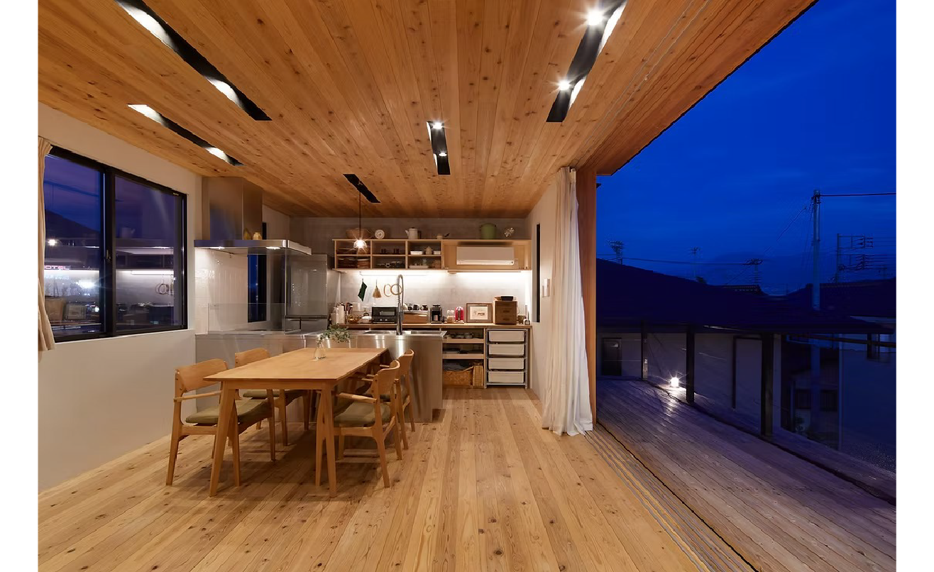 キッチンはバルコニーと隣り合う配置とし屋外にはシンクを設置。家庭菜園や植物の手入れ、BBQなど、外での活動をリビングの延長として楽しめる計画です。屋上は物干しや菜園スペースとしても使われ、暮らしの幅を自然に広げています。
