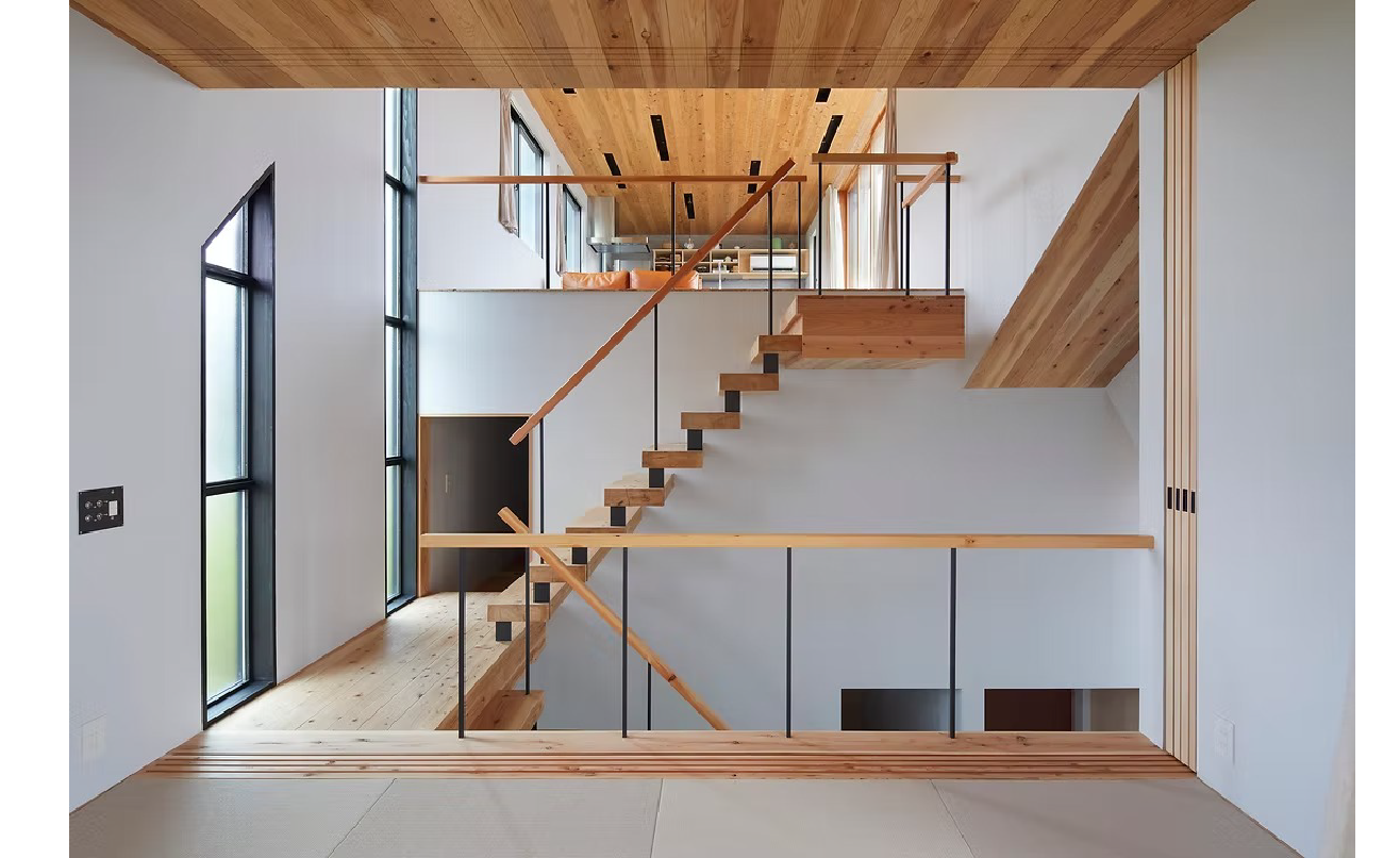 高低差によって視線や気配が自然に交差し、活発な家族構成にふさわしい一体感のある住空間が生まれる ── この家は風景と生活を無理なく結びつけ、日常の中に確かな実感を積み重ねていく住まいです。