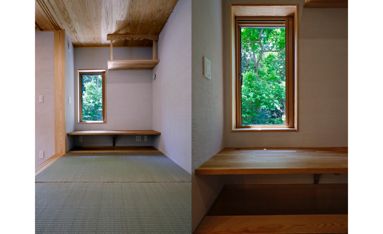 リビングに連続する畳スペースには造作のカウンターと棚を設置。読書や作業、来客時の居場所として多用途に使えるよう、高さや奥行きは大工と相談しながら決定。座った視線の先に緑が入るよう窓位置も細かく調整されています。