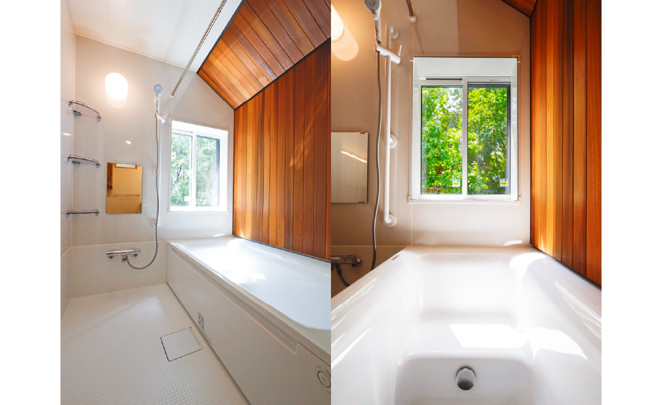 浴室はハーフバス仕様とし、下部はユニット、壁や天井には水に強いカナダスギを採用。座ったときに正面に緑が入るよう窓を設け、入浴中も森の気配を感じられる空間としています。
