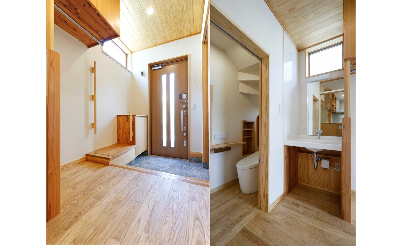 自然素材、太陽熱、雨水、そして手仕事。環境に配慮するという選択を、特別な行為にせず、日常の心地よさとして組み込んだ住まい。森とともに暮らす時間が静かに積み重なっていきます。